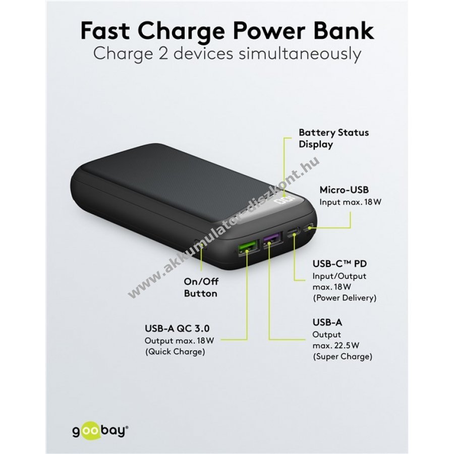 A 20000mAh kapacitású powerbank ideális hosszabb utazásokhoz. Az intelligens gyorstöltési módok Power Delivery és Quick Charge gyors feltöltést biztosítanak okostelefonok, okosórák és navigációs eszközök számára. 3 eszköz tölthető egyszerre 2 USB-A és 1 USB-C porton keresztül maximum 18W teljesítménnyel. A Power Delivery (USB-C) és Quick Charge (USB-A) akár négyszer gyorsabb töltést tesz lehetővé a hagyományos powerbankokhoz képest. Nagy kapacitásával megbízható társ mindennapi használatra és utazásra. A csúszásmentes felület biztonságos fogást és védelmet nyújt. A digitális LED kijelző pontosan mutatja az akkumulátor töltöttségi szintjét. A töltés USB-C vagy Micro-USB porton keresztül történik, a csomagban 0,3 m USB-A-USB-C kábel található. Univerzális USB csatlakozói számos márka, például Samsung, Xiaomi, Lenovo, Huawei, Apple iPhone és iPad készülékekkel kompatibilisek.