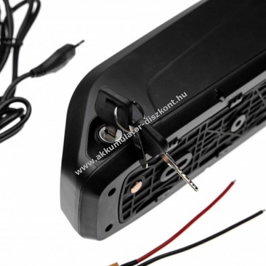 Új áruk, eredeti csomagolás Minőségi vhbw termékek. Technológia: Li-ion Feszültség: 48 V Kapacitás: 10,4Ah / 499,2Wh Cellaszám: 65 Fekete szín Súly akkumulátor: 2620g Teljes tömeg (vezető sínvel és a motor és az akkumulátor csatlakozó kábelével): 2870 g Az akkumulátor méretei (H x Sz x H): 36 x 8,7 x 8,5 cm * Vezetősín méretei: (L x Sz.) 34 x 6,4 cm Teljes méretek (H x Sz x H): 36,5 x 8,7 x 8,5 cm Az akkumulátort az alsó csőhöz rögzítették. Vezetősín két hosszúkás és egy kerek lyukkal A hosszúkás lyukak hossza: 21,35 mm Távolság a vezetősín végétől az első nyílás elejéig: 146 mm Távolság az akkumulátor szélétől: 42mm A lyukak közötti távolság: egyenként 48,55 mm M5 menetes csavarokhoz két távtartó gumi a hosszúkás lyukakhoz Vezetősín vezetékkimenettel (mínusz és plusz) a motor felé Kivágás mérete (HxS): 8 x 17mm A mélység távolsága a vezetősín oldalszélétől: 35 mm XT90 csatlakozó az akkumulátorról a motorra Hossz: 27cm Csatlakozókábel a motor és az akkumulátor között (2-pólusú) Hossz: 13,5 cm Akár 1000 töltési ciklus lehetséges Nincs memória hatása Akkumulátorkezelő rendszer Hőmérséklet és túlterhelés elleni védelem Az akkumulátor be- és kikapcsoló gombja LED töltöttségi szintjelzővel Zárható, hogy az idegen emberek ne lopják el az akkumulátort, és hogy az akkumulátor biztonságosan a vezetősínben üljön 1-pólusú csatlakozóval a töltőhöz Gumi borítással a töltőaljzaton
