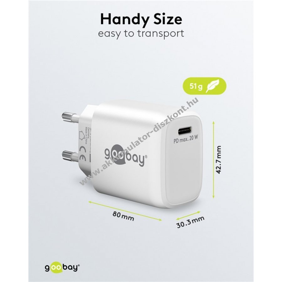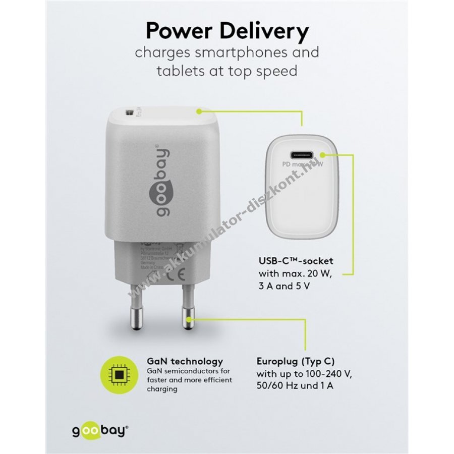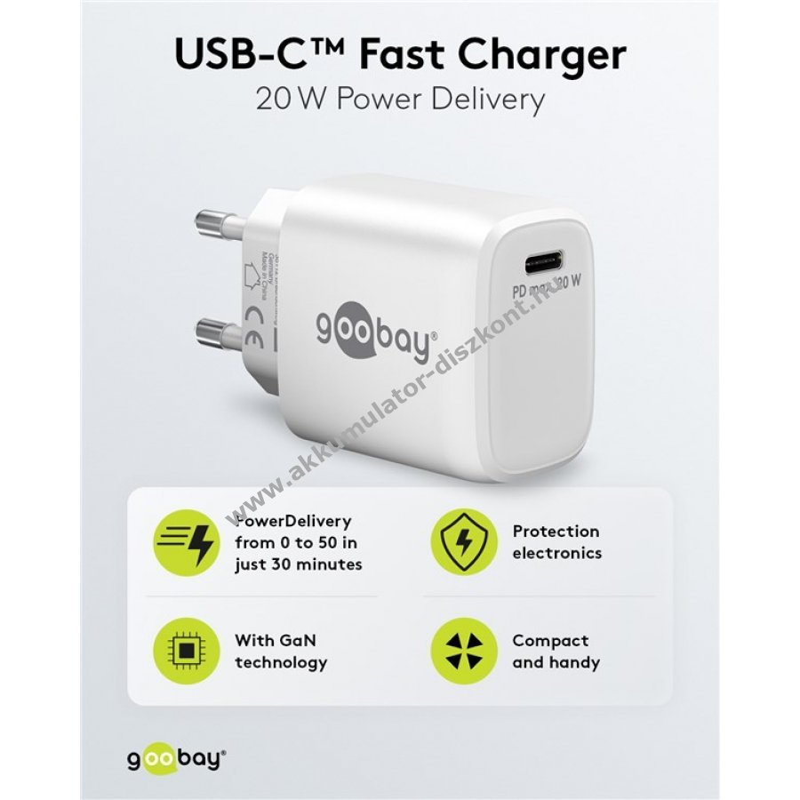 Kompakt gyorstöltő univerzális USB-C csatlakozóval okostelefonokhoz és táblagépekhez. 50% töltés 30 perc alatt a gyors töltési módnak köszönhetően akár négyszer gyorsabb a hagyományos töltőknél. 20 W teljesítmény ideális kisebb eszközökhöz, mint okostelefon, Bluetooth fejhallgató, tablet vagy powerbank. Kis méret és könnyű kialakítás utazáshoz is praktikus. GaN technológiás félvezetők gyorsabb és hatékonyabb töltést, valamint kisebb méretet biztosítanak. Power Delivery 3.0 biztonságos és dinamikus töltést garantál az eszköz optimális teljesítményével. Egyszerű dizájn lekerekített élekkel és sima felülettel. Kompatibilis Apple iPhone, Samsung, Xiaomi, LG, Huawei okostelefonokkal és Apple iPad, Samsung Galaxy táblagépekkel. Beépített védelem túlfeszültség, túláram és túlmelegedés ellen.