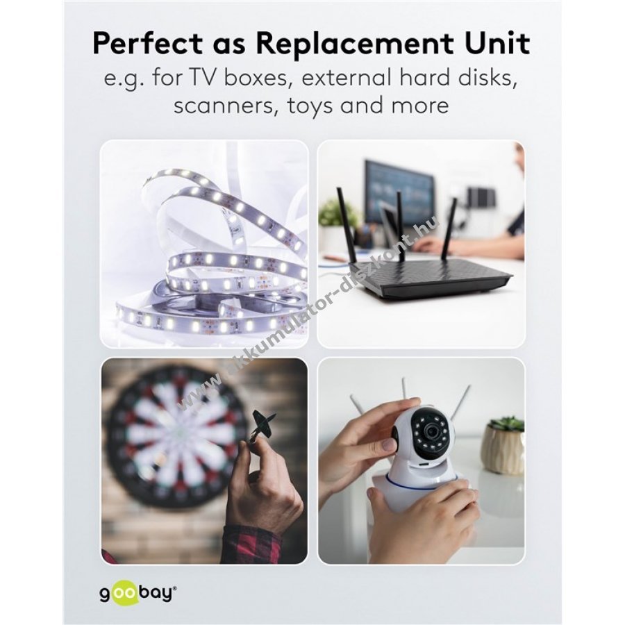 - fix feszültségű adapter, ideális csere tápegység TV boxhoz, routerhez, LED szalaghoz, videokamerához, digitális képkerethez, darts táblához, bébiőr készülékhez vagy játékokhoz