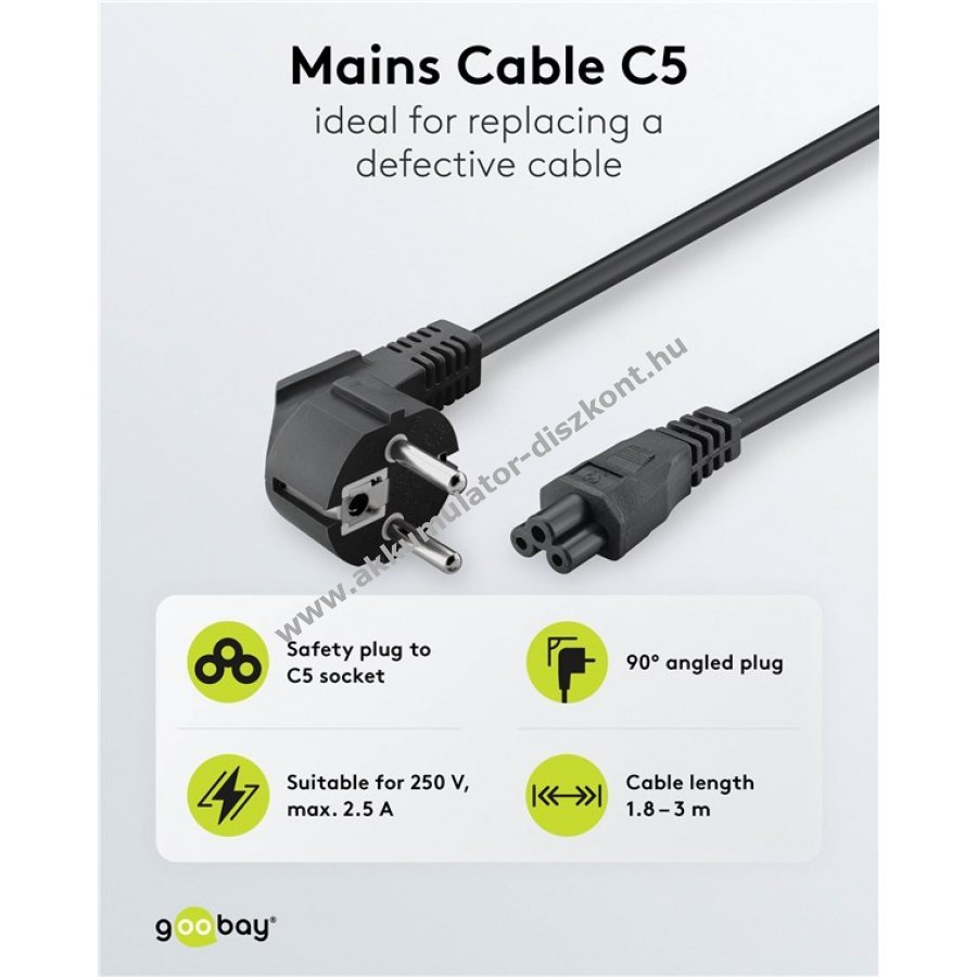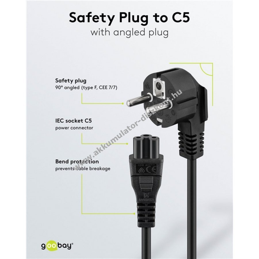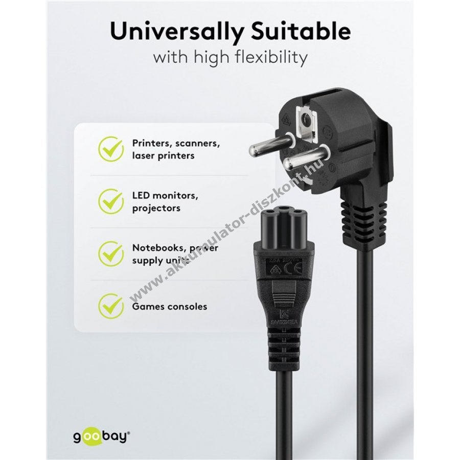 Univerzális hálózati kábel szögletes fém érintkezős csatlakozóval és IEC-60320-C5 csatlakozóval 1,8 m hosszban