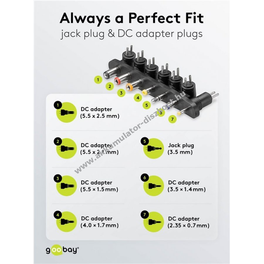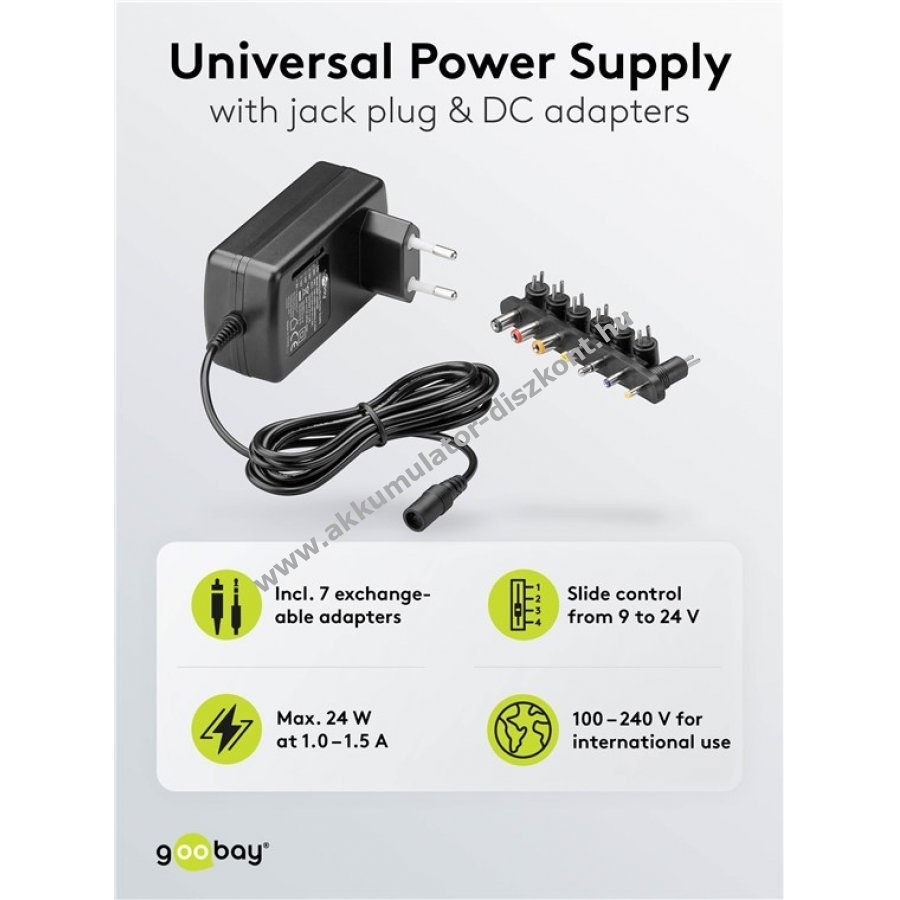 Tápegység videokamera router scanner effektkészülék crosstrainer darts játék babaőrző játékokhoz cserélhető körcsatlakozókkal így nem kell több töltőt vásárolni a kimeneti feszültség kapcsolóval állítható 9 V 12 V 15 V 18 V 20 V 24 V 1 0-1 5 A terhelhetőséggel 7db adapterfej 3 5 mm jack dugó 2 35x0 70 mm 3 50x1 40 mm 4 00x1 70 mm 5 50x1 50 mm 5 50x2 10 mm 5 50x2 50 mm széles bemeneti feszültségtartomány 100 V-240 V európai típusú CEE 7/16 csatlakozó világszerte használható a tápegység beépített biztosítékai rövidzárlat túlterhelés túlfeszültség és túláram ellen védenek