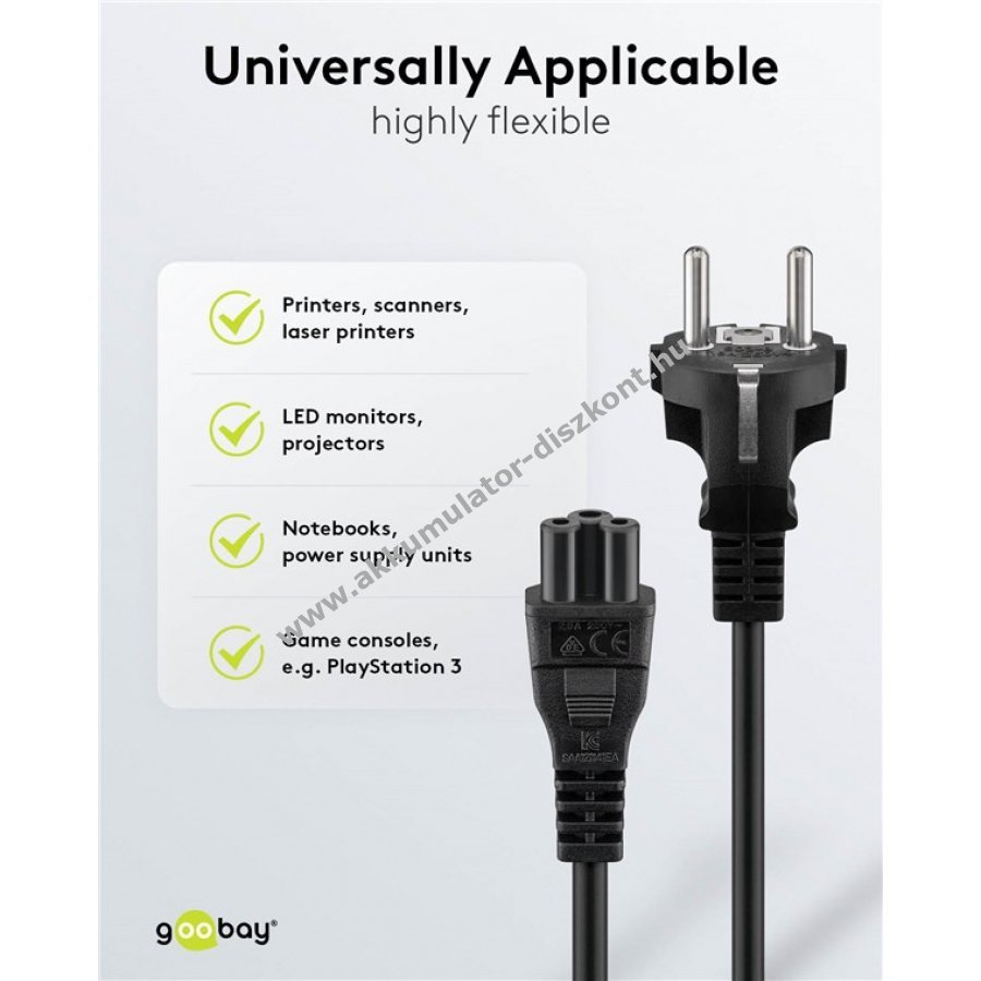Csere hálózati kábel hibás vezetékekhez laptop tápegységekhez PC monitor vagy projektor készülékekhez Kompatibilis különböző audio eszközökkel és irodai berendezésekkel például mélynyomó erősítő keverő nyomtató vagy iratmegsemmisítő 3 pólusú kábel kis készülék csatlakozóval IT eszközök és háztartási gépek csatlakoztatásához Univerzálisan használható földelt készülékekhez max 2,5 A terhelhetőséggel Rugalmas PVC külső burkolat közepes mechanikai igénybevételhez semleges fekete színben
