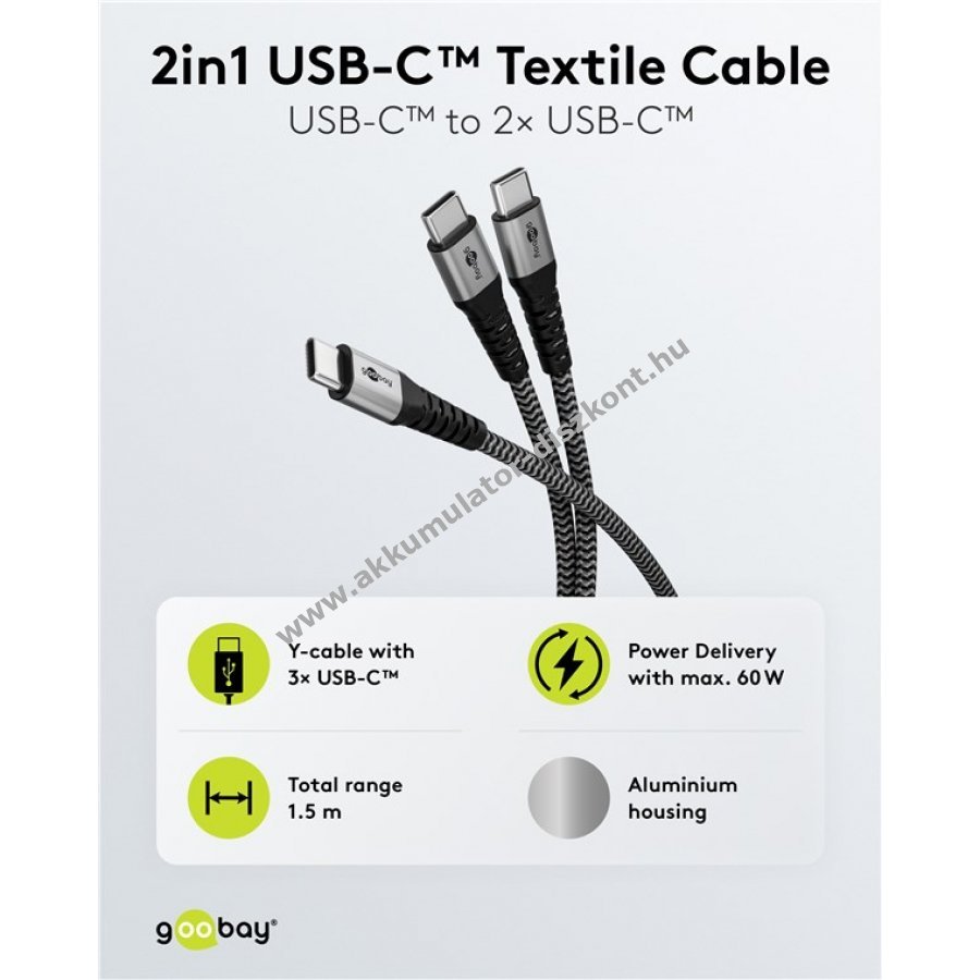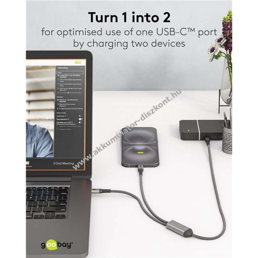 Az USB-C töltőkábel akár két csatlakoztatott USB-C eszközt is feltölthet összesen 60W teljesítménnyel egyetlen USB kimeneten keresztül, pl. okostelefont, táblagépet, laptopot, Bluetooth fejhallgatót vagy okosórát.