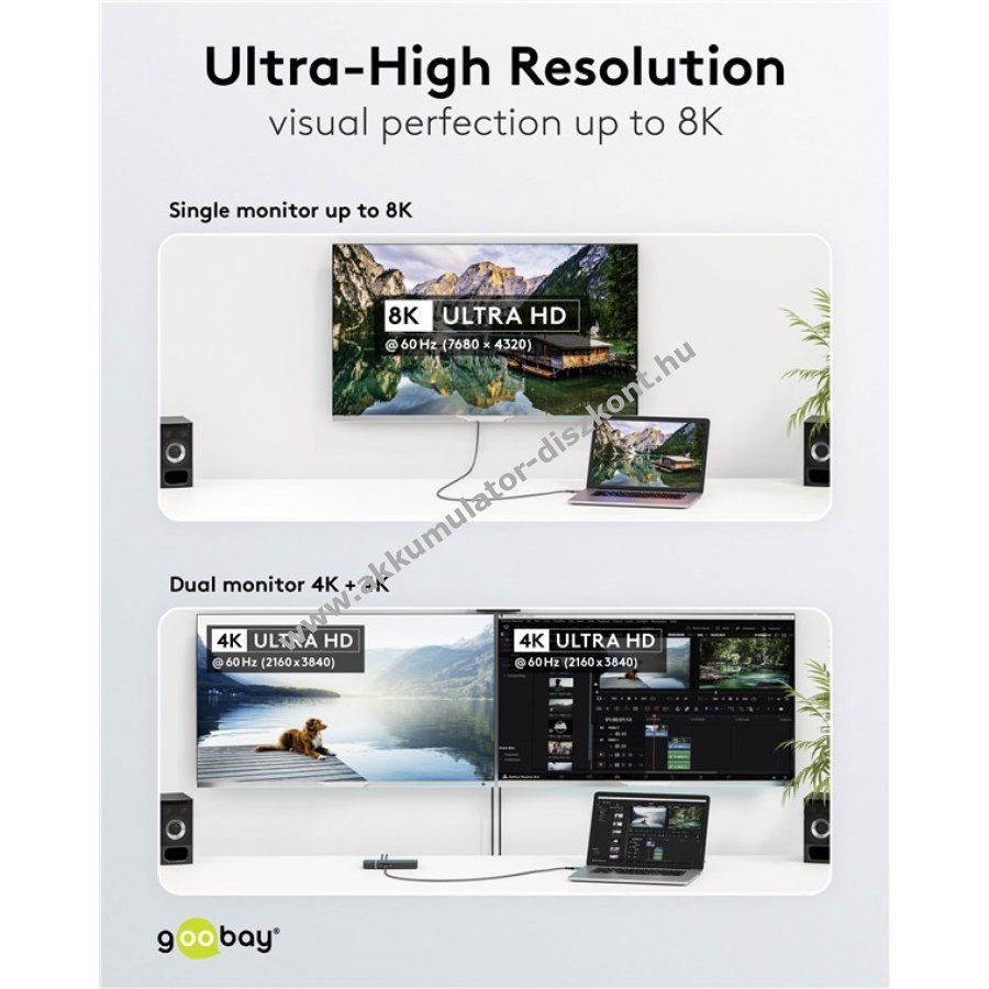A Power Delivery (EPR) által lehetővé tett 240 W a nagy teljesítményű laptopok, dokkolóállomások és más energiaigényes multimédiás eszközök kulcsfontosságú tápegységévé teszi az USB-kábelt. Az akár 40 Gbit/s sebességű adatátvitel villámgyors adatátvitelt biztosít - így az USB-C kábel 8-szor gyorsabb, mint az USB 3.0, és tökéletes az NVMe merevlemezek, HD filmek, sorozatok, zenék és fényképek számára. A kábel támogatja az ultramagas felbontást, akár 8K 60Hz/4K 120Hz-et egyetlen monitoron, illetve 4K 60Hz-et, ha a jelet egy hubon keresztül két monitor között osztják meg. Támogatja a HDR10-et, és tökéletesen alkalmas HD-videók külső monitorokra, TV-kre vagy projektorokra történő streamelésére, pl. okostelefonokról, notebookokról, táblagépekről és más gazdatestekről. Az eddigi legrugalmasabb USB-kábel: Lehetővé teszi az adatalagutat a DisplayPort 2.1 és a PCIe 4.0 portokról, és közvetlenül csatlakoztatható a Thunderbolt 4 vagy Thunderbolt 3 portokhoz. Támogatja az USB-C portokat DisplayPort Alt móddal a nagyfelbontású videóátvitelhez, és visszafelé kompatibilis az USB 3.2, 3.1 és 3.0 (USB-C) szabványokkal.