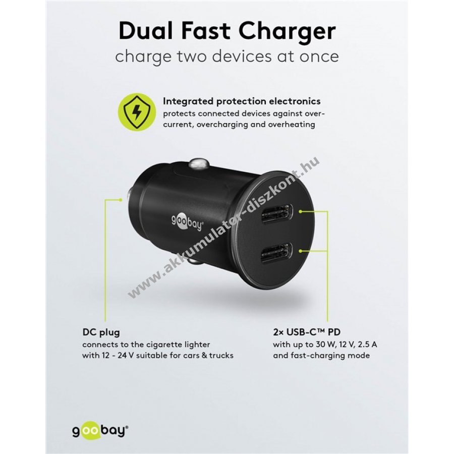 Goobay autós dupla USB-C gyorstöltő, (Power Delivery), 30W, 12V/24V - Kiárusítás!