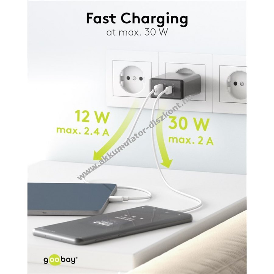 a Power Delivery funkcióval akár 4-szer gyorsabban tölt, mint a hagyományos töltők (0 %-ról 50 %-ra 30 perc alatt). A gyorstöltő kompatibilis az olyan okostelefonokkal, mint az Apple, Samsung, Xiaomi, LG, Huawei, valamint a táblagépekkel, mint az Apple iPad és a külső akkumulátorokkal. Az USB-C töltőport integrált védelmi elektronikája megvédi a csatlakoztatott eszközöket a túláram, a túltöltés és a túlmelegedés ellen. Kompakt kialakításának köszönhetően az USB-C töltő bármilyen táskában elfér, és ideális útitárs. A 100-240 V-os bemeneti feszültségtartománynak köszönhetően a Goobay USB-C hálózati adapter külföldön is használható. A Goobay USB-C töltő 1db USB-A porttal és 1db USB-C porttal rendelkezik.