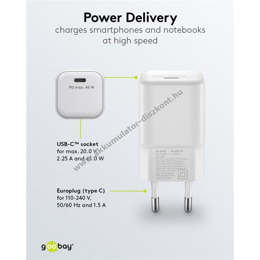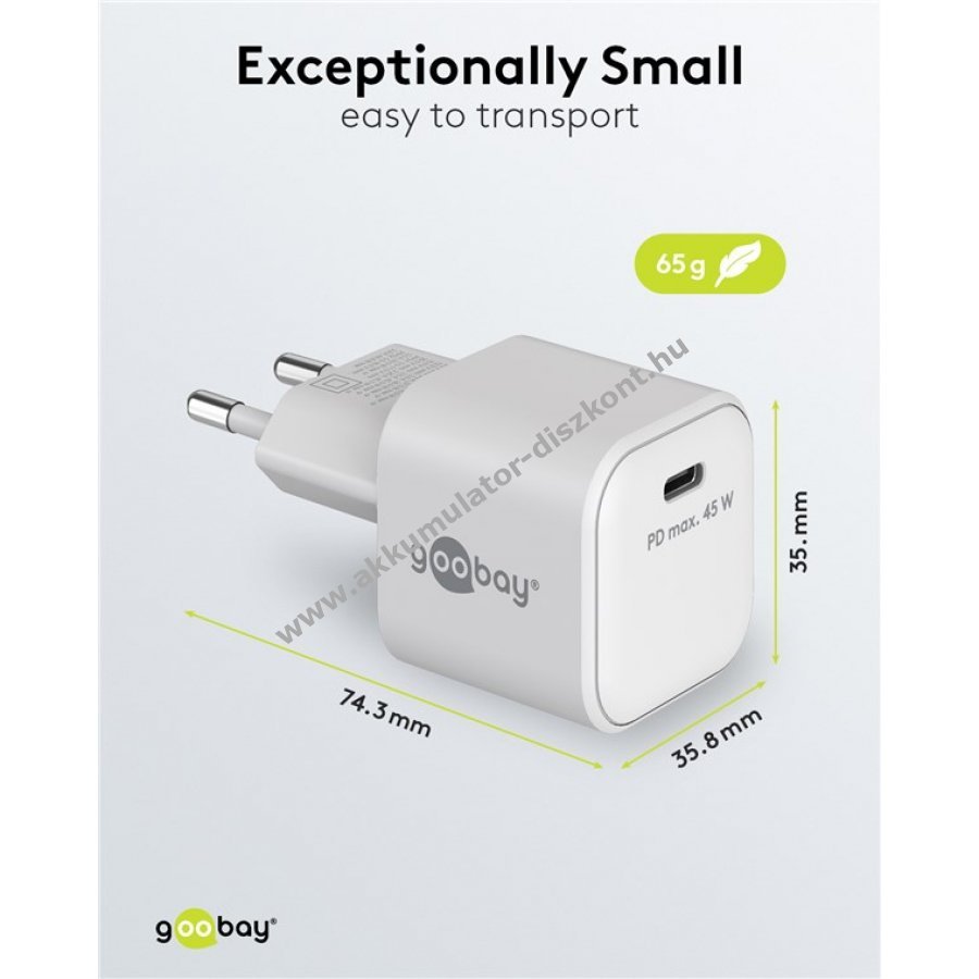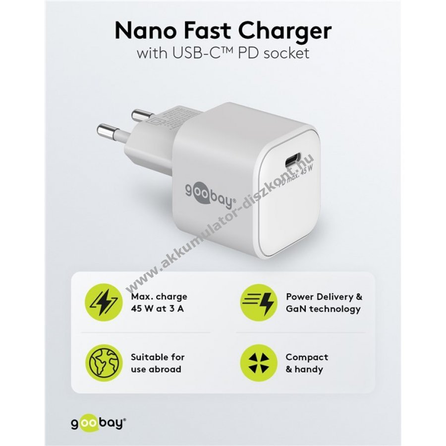USB-C Power Delivery GaN nano gyorstöltő (45W), fehér - A készlet erejéig!