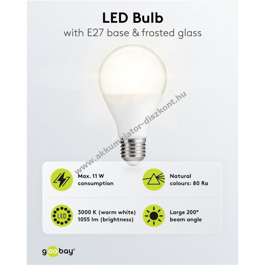 Goobay LED izzó 200°-os sugárzási szöggel és E27 foglalattal meleg fehér fény, 3000 K, mint egy izzólámpa Sokoldalú és alkalmas a halogénlámpák és a hagyományos izzók energiatakarékos kiváltására A LED-lámpa a 80 Ra-nak köszönhetően valódi, természetes színeket produkál Az E27-es izzó kevés hőt termel és bekapcsoláskor azonnal világít A matt E27-es LED-izzó nagyon hosszú élettartamot biztosít