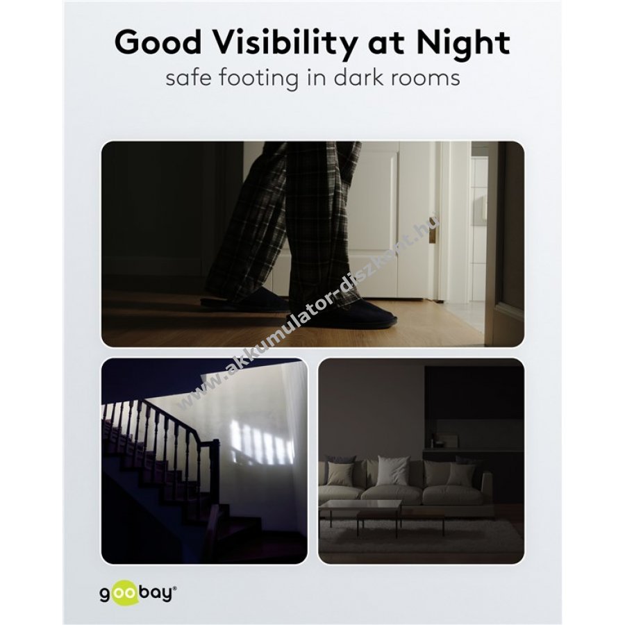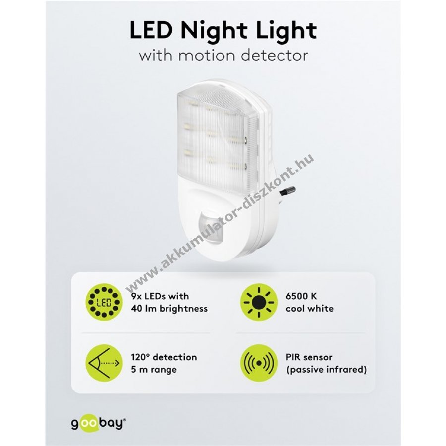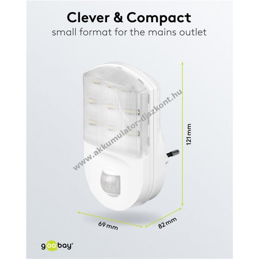 Praktikus, konnektorba dugható Goobay LED éjszakai lámpa mozgásérzékelővel, amely segít elkerülni a botlásokat és biztonságos tájékozódást nyújt sötétben.