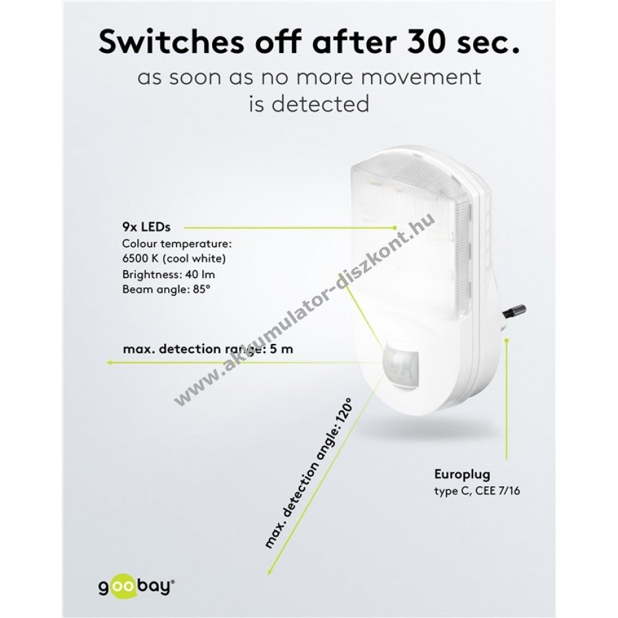 - Automatikus kikapcsolás 30s után, előre beállított érzékenység (<10lm)
