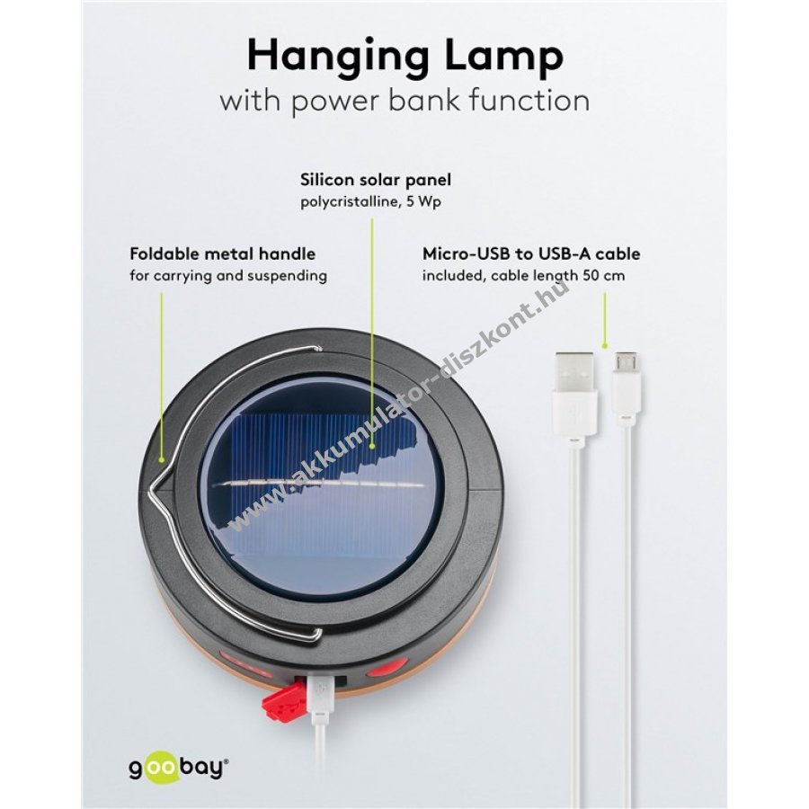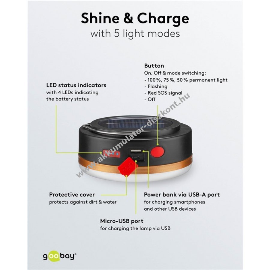 Kempinglámpa 6 fénymóddal nyomógombos kapcsolóval és IR távirányítóval. 4 fényerőszint és SOS jelzés elérhető. Beépített 3,7V 2000mAh Li-ion 18650 akkumulátor powerbank funkcióval. USB töltés 4 órán belül, kb. 4 órás világítási idő. Tölthető napelemes panelről vagy micro-USB kábellel. 220 lumen hidegfehér fény 6800K színhőmérséklettel. Fém hajlítható fogantyúval hordozható vagy akasztható. Időjárásálló IP44 védelem. Anyaga ABS és PP. Ideális kempinghez, túrázáshoz, grillezéshez vagy vészhelyzetekhez.