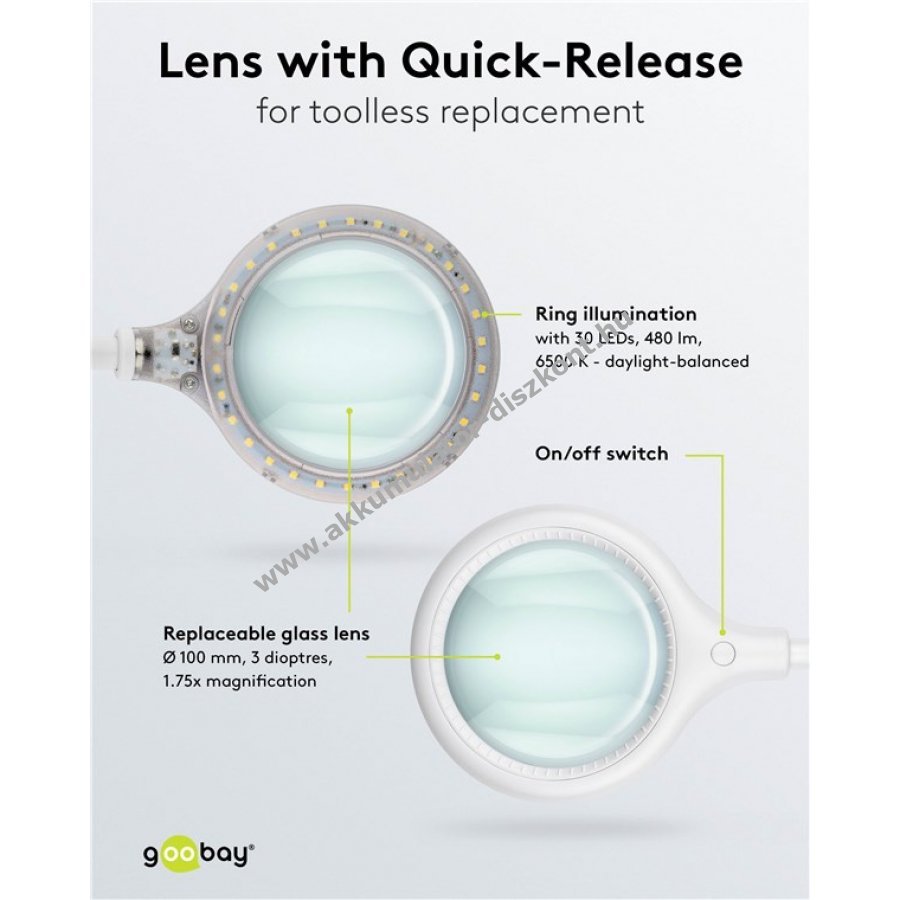 Kétfunkciós nagyítólámpa állvánnyal vagy csipesszel rögzíthető. 30 tartós nappali fehér SMD LED biztosítja a színhelyes megvilágítást. 100 mm átmérőjű üveglencse 3 dioptriával és 1,75-szeres nagyítással, gyorscserélhető szerszám nélkül. Rugalmas nyak a pontos irányításért. Széles körben használható kozmetikában olvasáshoz és precíziós munkákhoz, például forrasztáshoz vagy kézműves tevékenységhez. Puha párnázatú csipesz a biztonságos és felületkímélő rögzítéshez.