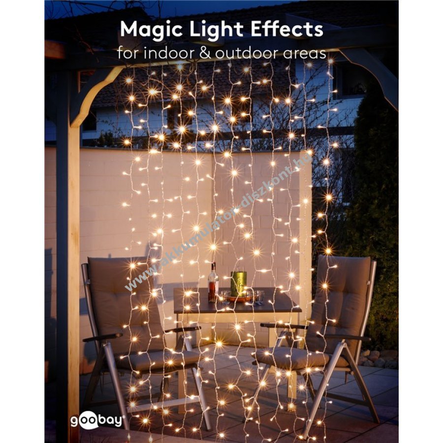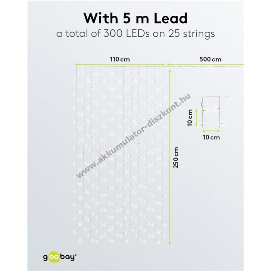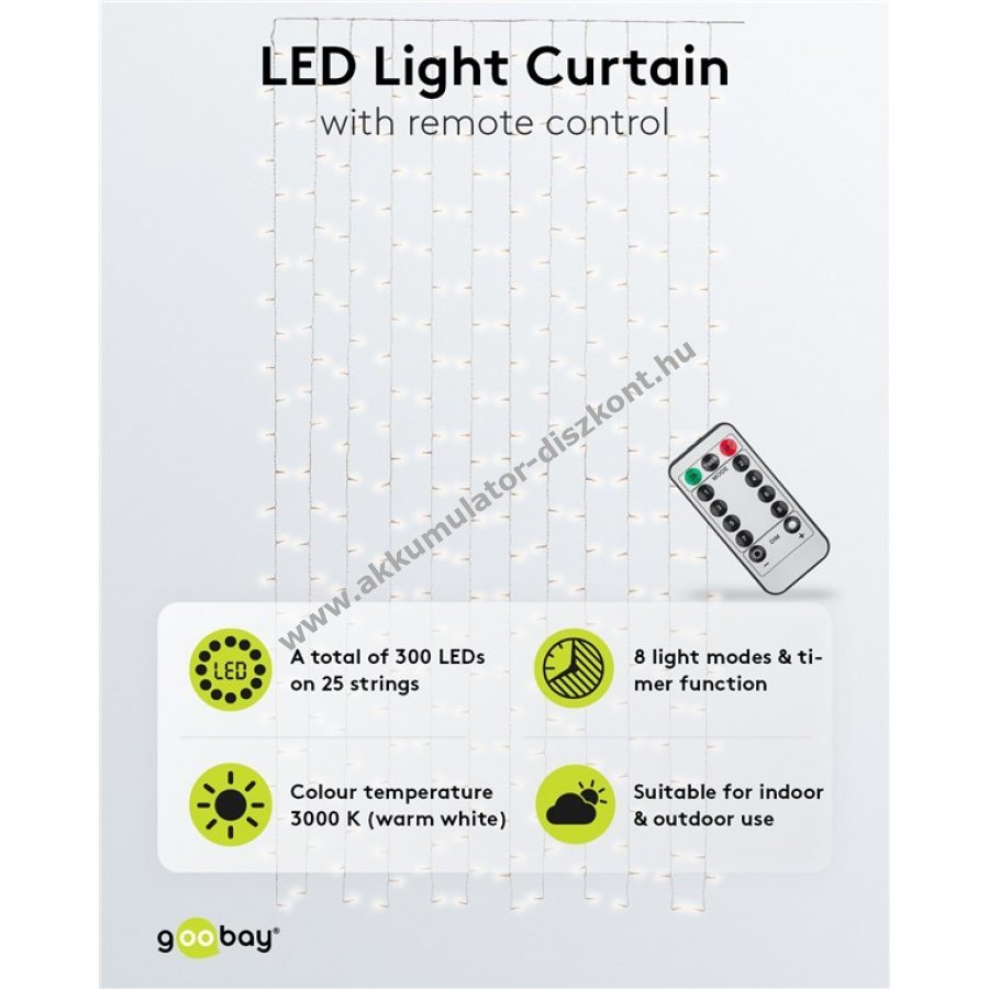 300 meleg fehér LED fényfüggöny belső és kültéri használatra IP44 védelemmel. 12 szálonként 25 LED 2,5 m hosszban átlátszó kábellel. Teljes hossz 6,10 m, tápkábel 5 m, LED-ek és szálak távolsága 10 cm. 8 világítási mód 13 gombos távirányítóval vezérelhető. Időzítő 6 óra bekapcsolt és 18 óra kikapcsolt állással, memória funkcióval. Fényerőszabályzó 25%, 50%, 75% és 100% fokozatokkal. Tápegység 100-240V AC bemenettel, 31V DC 193mA kimenettel, 6W teljesítménnyel. Ideális karácsonyi, party vagy esküvői dekoráció.