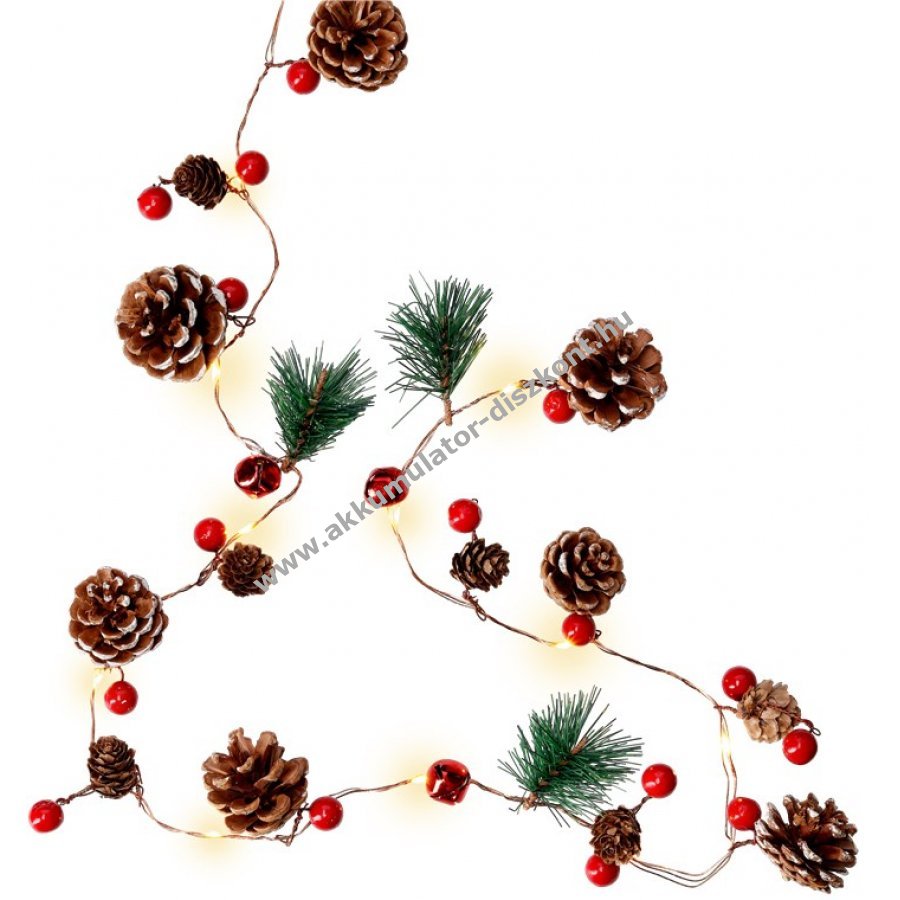 hangulatos hangulatot teremt ősszel és télen nappalik, ablakok, lépcsőkorlátok és asztalok díszeként. ideális éttermek, bárok és üzletek kirakatainak karácsonyi díszítésére időzítő funkcióval: 6 óra bekapcsolás/18 óra kikapcsolás, 3 állású kapcsoló: Be/Ki/időzítő elemmel működtethető (2db AA, nem tartozék) beltéri használatra engedélyezett (IP20 védettségi osztály) teljes hossza: 2,20 m, tápkábel: 30 cm, LED-ek közötti távolság: 10 cm, rugalmas ezüst drót függők: nagy valódi fenyőtobozok 4 x 5 cm, kis valódi fenyőtobozok 2,5 x 2 cm, piros bogyók 1,4 cm, piros harangok 1,8 cm, fenyőgallyak 5 x 5 cm.