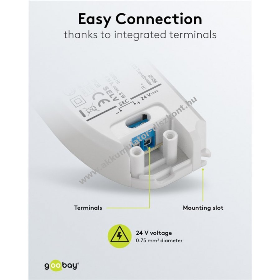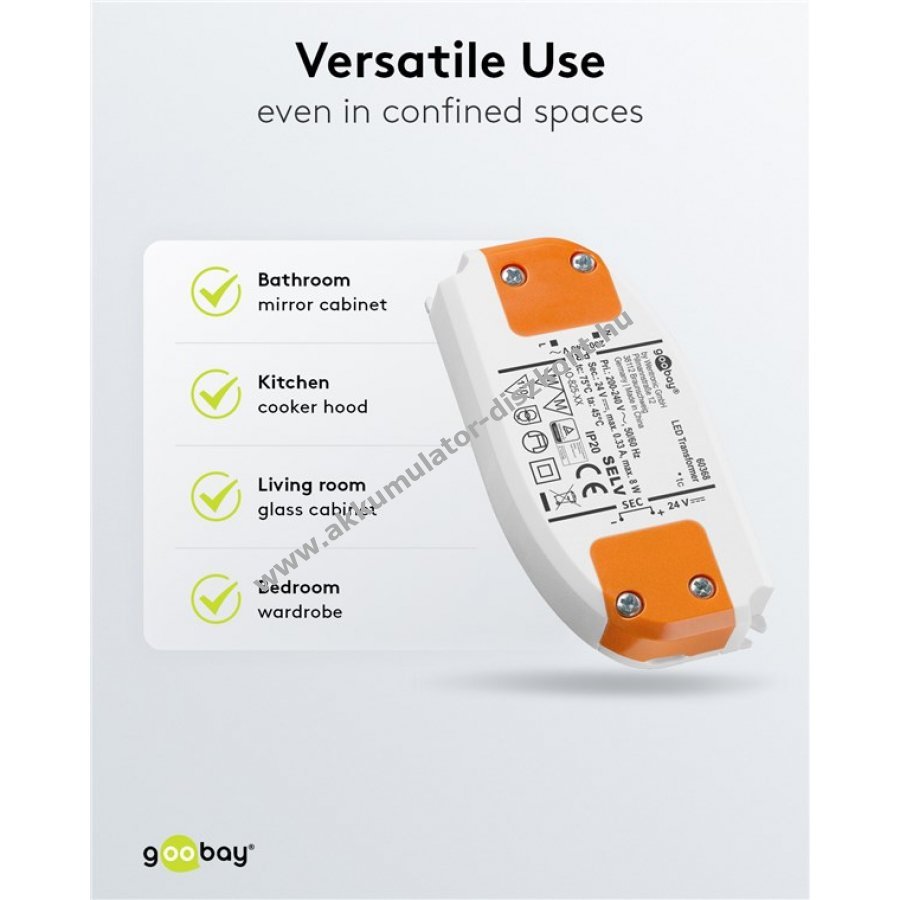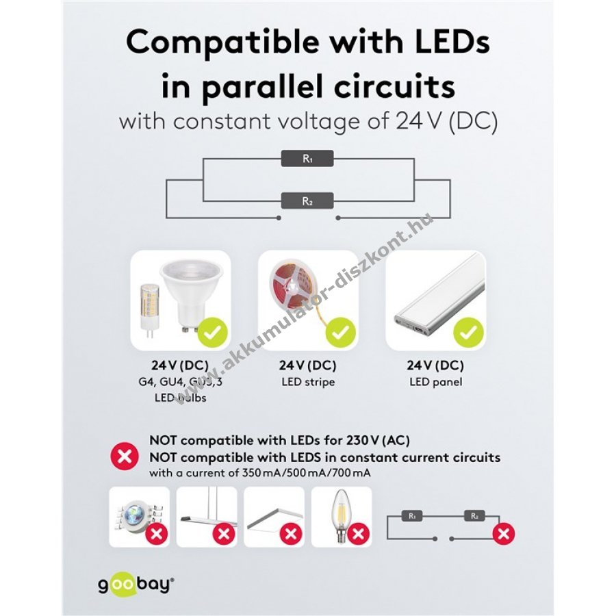 A tápegység állandó 24V DC feszültséget biztosít LED-ek számára nagy rugalmassággal különböző hosszúságú LED-szalagok csatlakoztatásához. Kompakt kialakítású LED tápegység minimum terhelés nélkül 200-240V AC hálózathoz. 24V DC állandó feszültség lehetővé teszi párhuzamos kapcsolásban LED-ek hozzáadását vagy eltávolítását és változó hosszúságú LED-szalagok használatát. Egyszerű és gyors telepítés beépített csavaros klemmen segítségével. Alacsony hőfejlődés és lapos kialakítás helytakarékos szerelést tesz lehetővé szűk helyeken is. Bútorba építésre engedélyezett diszkrét elhelyezéshez például szekrény mögött. Beltéri használatra (IP20) alkalmas párhuzamos kapcsoláshoz védelemmel túlfeszültség és rövidzárlat ellen. Elektronikus szigetelés II védelmi osztály szerint. Nem dimmelhető.