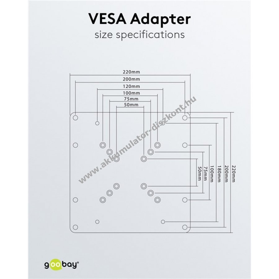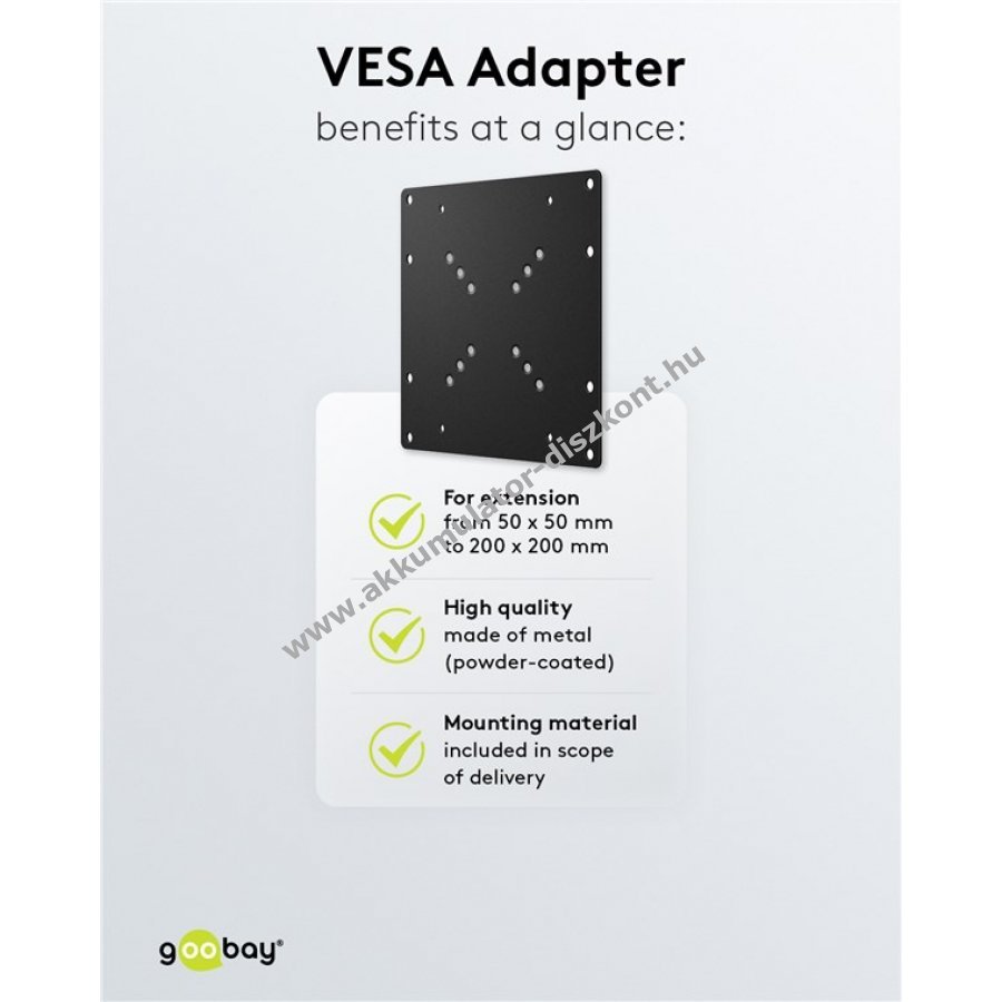 a VESA-méreteknek a fali tartó és a TV közötti, legfeljebb 200x200 mm-es mérethez való igazításához Ez a VESA-adapter lehetővé teszi, hogy a fali tartó 50 mm x 50 mm-es furattávolságát akár 200 mm x 200 mm-re növelje. A VESA adapter a TV és a fali tartó közötti furattávolságot igazítja. A maximális terhelés az adott fali tartótól függ. Az adapter kiváló minőségű porszórt fémből készül. A rögzítőanyagot (csavarok, anyák stb.) a csomag tartalmazza.