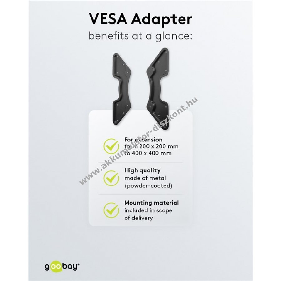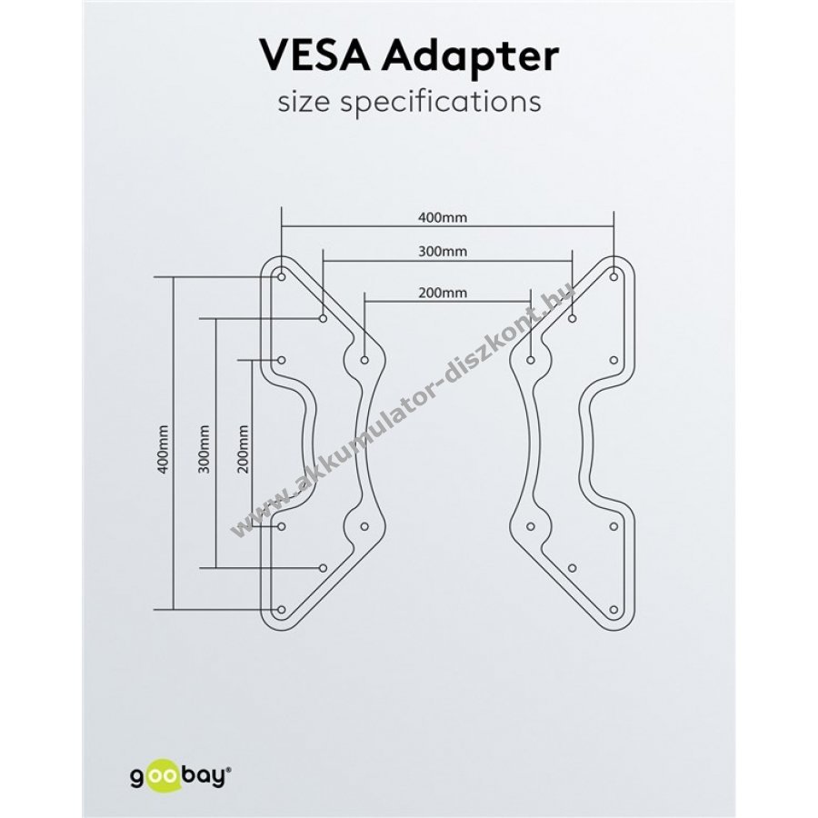 Ez a VESA adapter lehetővé teszi, hogy a fali tartó 200 mm x 200 mm-es furattávolságát 400 mm x 400 mm-re növelje. A VESA adapter a TV és a fali tartó közötti furattávolságot igazítja. Az adapter a VESA furattávolságot 200 mm x 200 mm-ről 400 mm x 400 mm-re bővíti. A maximális terhelés az adott fali tartótól függ. Az adapter kiváló minőségű porszórt fémből készül. A rögzítőanyagot (csavarok, anyák stb.) a csomag tartalmazza.