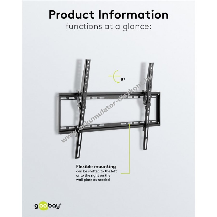 A lapos fali tartó a TV-t elegánsan laposan és helytakarékosan tartja a falon, mindössze 20,5 mm-es, és akár 8°-ig dönthető. A nyitott keretszerkezet támogatja a TV szellőzését és lehetővé teszi a hátsó csatlakozók elérését. Alkalmas fali tartó a legtöbb népszerű márkájú (pl. Samsung (QLED és LED is), Sony, Philips, LG) és méretű (pl. 40 hüvelykes, 43 hüvelykes, 49 hüvelykes, 50 hüvelykes, 55 hüvelykes, 58 hüvelykes, 65 hüvelykes) lapos és hajlított TV készülékhez. Könnyű felszerelés és kompatibilis a 200 x 200 mm, 300 x 300 mm, 400 x 200 mm, 400 x 400 mm, 600 x 400 mm VESA szabványokkal
