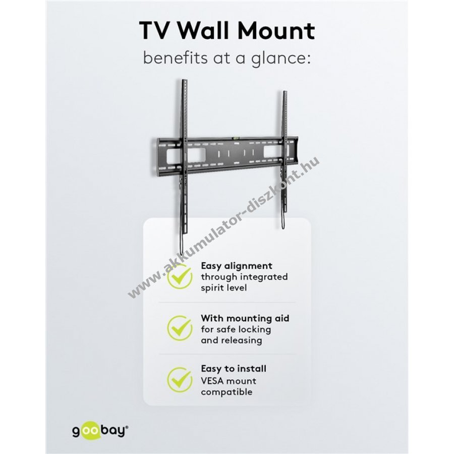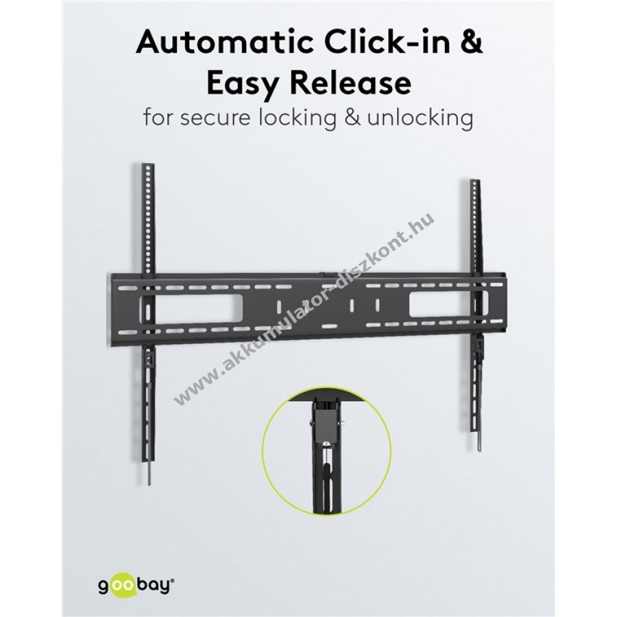 A rendkívül lapos fali tartó a TV-t elegánsan laposan és helytakarékosan tartja a falon, mindössze 30,5 mm-es.Automatikus bepattanás és egyszerű kioldás - A tévé felakasztásakor a biztonságos bepattanást és kioldást biztosító rugós reteszeléssel ellátott rögzítési segédeszköz (nincsenek kézzel rögzítendő reteszelőcsavarok) gyerekjátékká teszi a telepítést. A beépített vízmérték biztosítja a szerelés egyszerű összehangolását. Alkalmas fali tartó a legtöbb népszerű márkájú (pl. Samsung (QLED és LED is), Sony, Philips, LG) és méretű (pl. 50 hüvelykes, 55 hüvelykes, 58 hüvelykes, 65 hüvelykes, 75 hüvelykes, 85 hüvelykes) lapos és hajlított televízióhoz. Egyszerű felszerelés és kompatibilis a VESA szabványokkal 300 x 300 mm, 200 x 200 mm, 400 x 200 mm, 400 x 400 mm, 600 x 400 mm.
