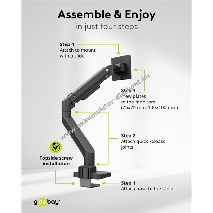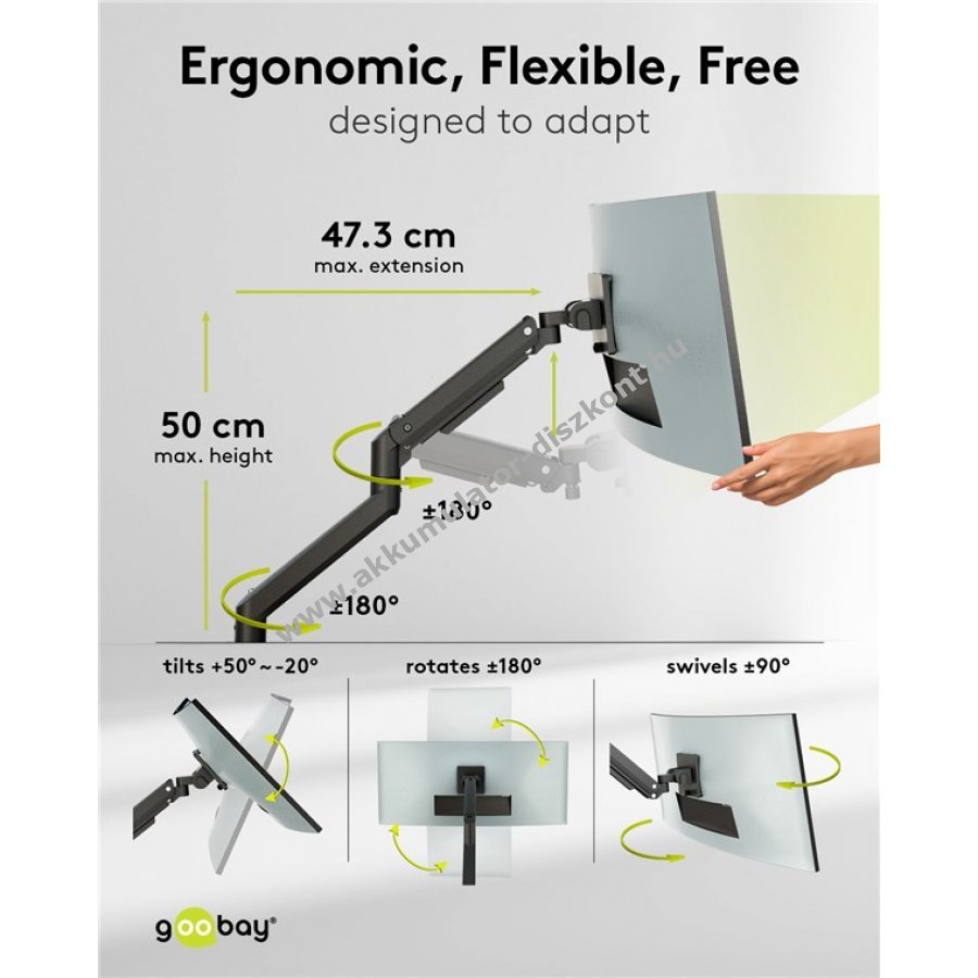 Ajánlott asztallap vastagság 12mm és 50mm között, VESA kompatibilitás 75mm x 75mm, 100mm x 100mm, nehezebb gaming és ívelt monitorokhoz tervezve