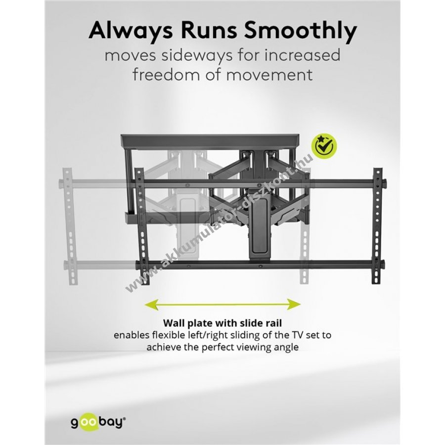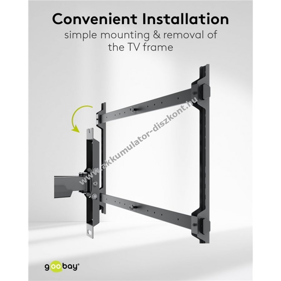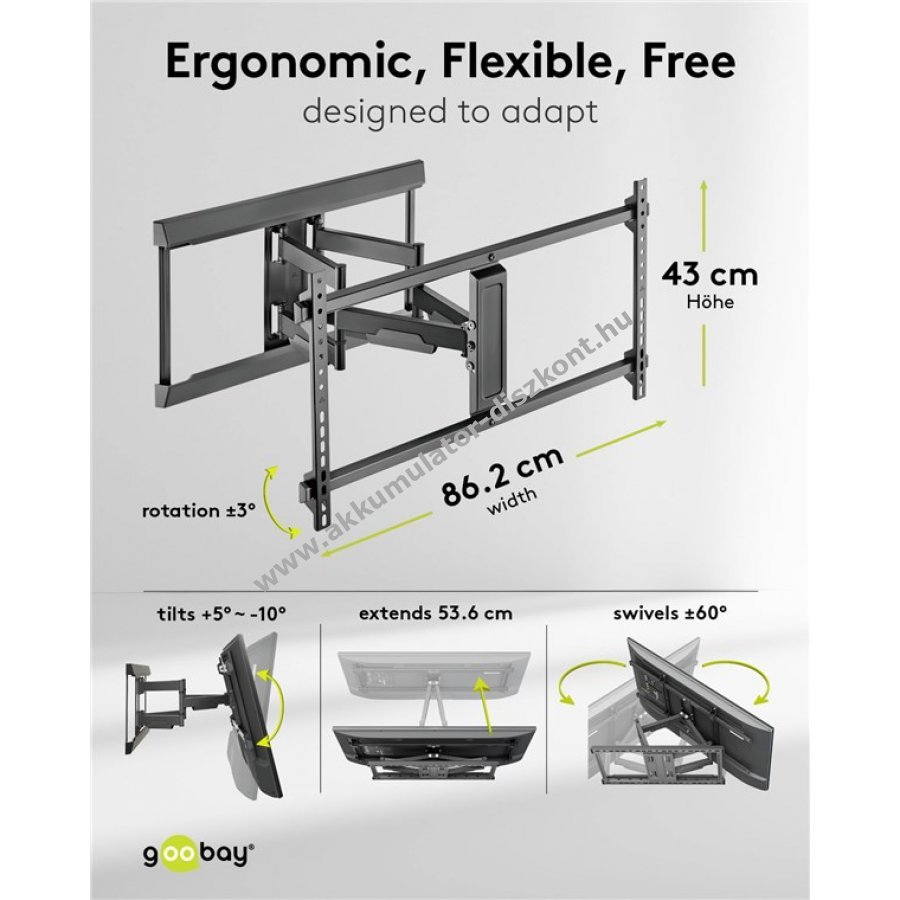 Teljes flexibilitás, forgatható, dönthető, oldalasan mozgatható, VESA kompatibilitás 200x100 mm, 200x200 mm, 300x200 mm, 400x200 mm, 300x300 mm, 400x300 mm, 400x400 mm, 600x400 mm, 800x400 mm