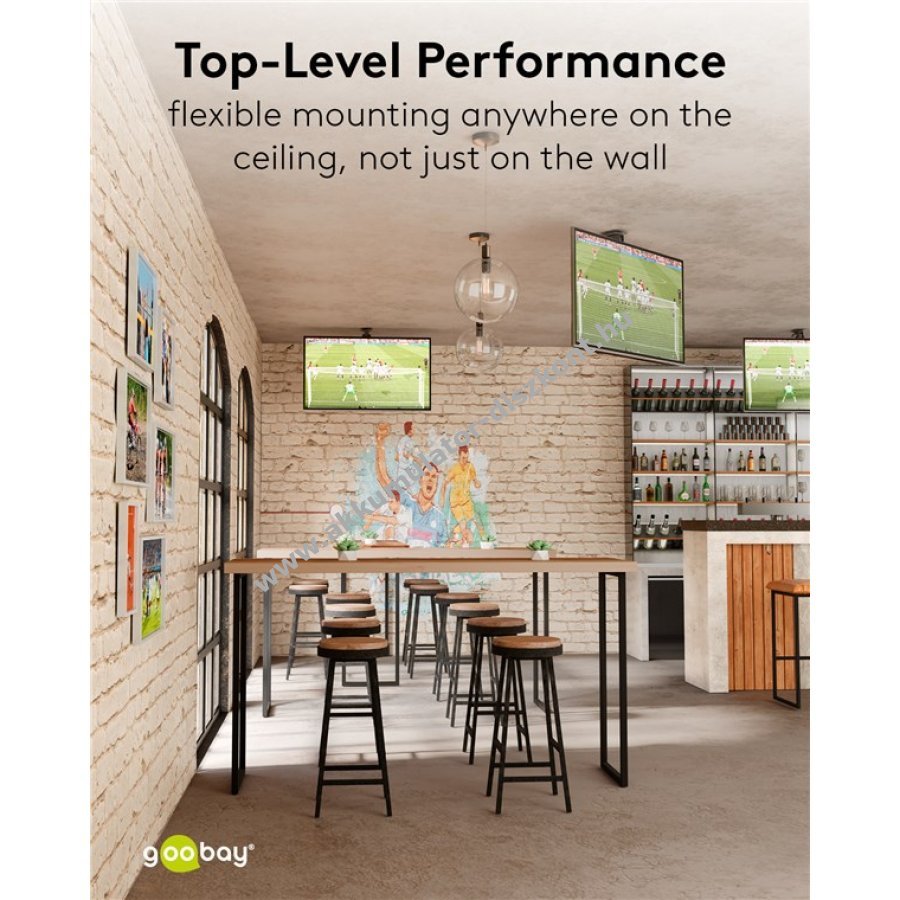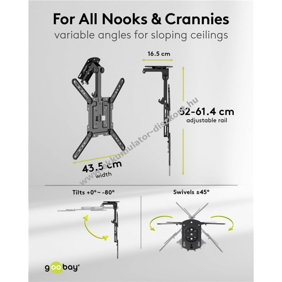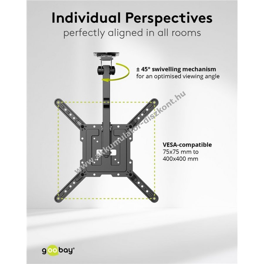 Forgatható oldalirányban, mennyezeti szög állítható, felhajtható és záró funkcióval, VESA kompatibilitás 75x75 mm, 100x100 mm, 100x200 mm, 200x100 mm, 200x200 mm, 200x300 mm, 300x200 mm, 200x400 mm, 400x200 mm, 300x300 mm, 300x400 mm, 400x300 mm, 400x400 mm