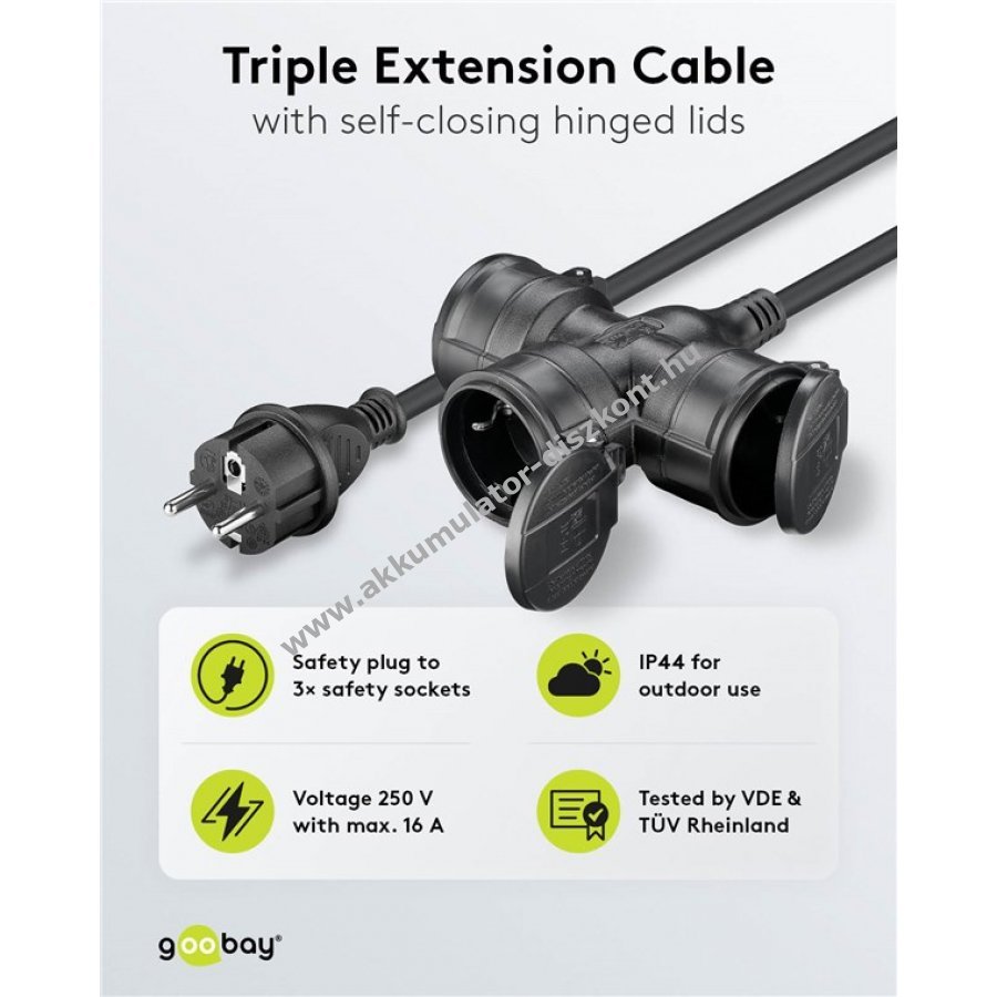 Kültéri használatra alkalmas háromutas hosszabbítókábel 5 m hosszban fekete színben. 3 csatlakozóval bővíti a hálózati aljzatot, ideális háztartási gépekhez beltéren és kültéren egyaránt. IP44 védelemmel rendelkezik, így fröccsenő víz ellen védett, alkalmas nedves helyiségekbe és időszakos kültéri használatra.