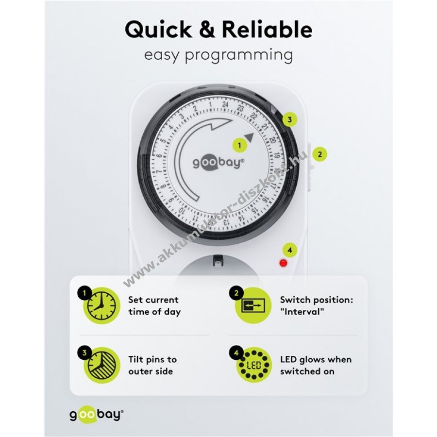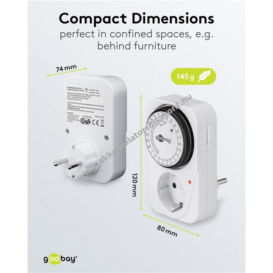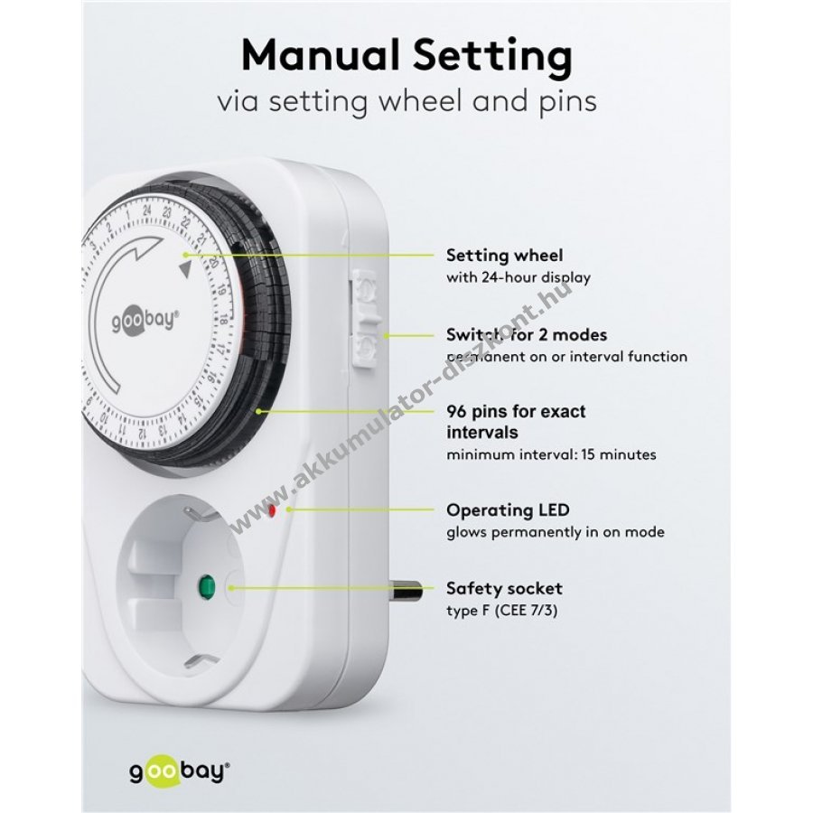Goobay analóg időkapcsoló pontos vezérlést biztosít elektronikus készülékekhez. 15 perces lépésekben napi 96 kapcsolási ciklust tesz lehetővé. Az időkapcsoló közvetlenül csatlakoztatható védőérintkezős aljzathoz beltéri használatra. Mechanikus működésű, ideális akváriumvilágításhoz, redőnyhöz, keringetőszivattyúhoz, vízszivattyúhoz, zsaluzathoz, terráriumhoz vagy karácsonyi világításhoz. Az állapotot ellenőrző LED jelzi. Az oldalán kapcsolóval folyamatos üzemmódra állítható.