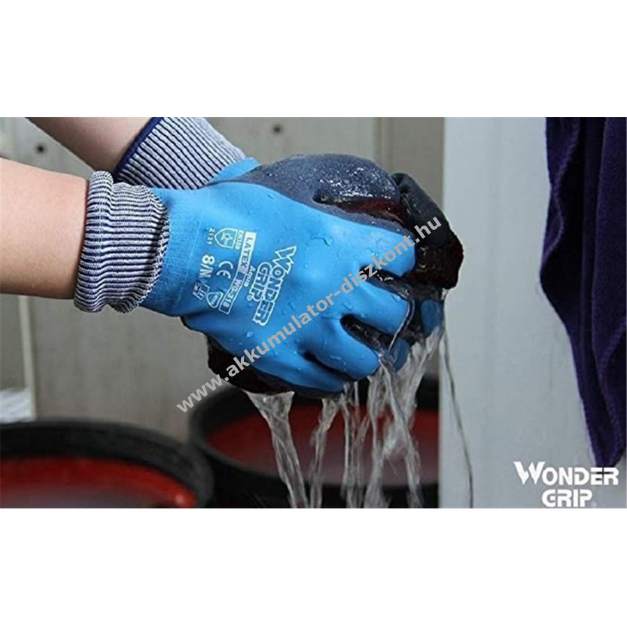 Dupla teljes latexbevonatú munkavédelmi kesztyű 13-Gauge nylon béléssel, amely kiváló tapadást és tartósságot biztosít nedves és száraz környezetben. 100% vízálló kialakítás, párnázott tenyér a fokozott kényelemért és védelemért. Wonder Grip technológia a természetes illeszkedésért és kiváló rugalmasságért.