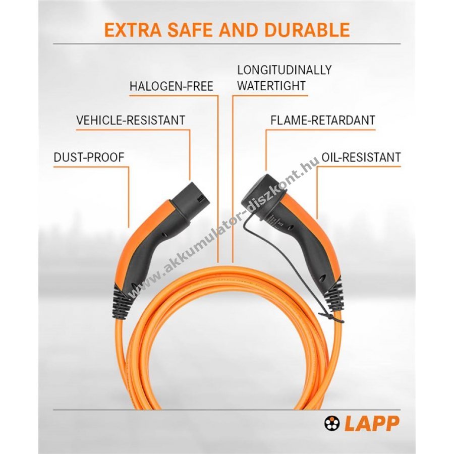 A LAPP 2-es típusú töltőkábele lehetővé teszi az egyszerű és gyors, akár 22 kW-os töltést nyilvános vagy privát töltőállomáson vagy fali dobozon. A 3-fázisú csatlakozásnak (32A) köszönhetően a kábel 440 V (AC) névleges feszültség mellett különösen gyorsan tölt fel. A rendkívül robusztus, áthajtásbiztos kábel és dugó ezüstözött érintkezőkkel garantálja a különleges tartósságot. A járműoldali csatlakozó fedőfedele véd a por, a szennyeződés és a víz behatolása ellen a töltések között. Olajálló és vízálló EV töltőkábel magas nedvességvédelemmel az IP55 védelmi osztály szerint, üzemi hőmérséklet -40 °C és 50 °C között. Az elektromos autó töltőkábel helytakarékosan tárolható és könnyű kezelni könnyű súlyának köszönhetően Az érvényes IEC és EN szabványok szerint gyártott, európai járművekkel és töltőállomásokkal, valamint CCS-csatlakozásokkal (Combo 2) kompatibilis 3. üzemmódú töltőkábel.