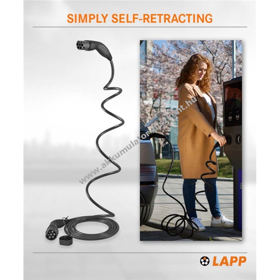 A LAPP 2-es típusú töltőkábele lehetővé teszi az egyszerű és gyors, akár 22 kW-os töltést nyilvános vagy privát töltőállomáson vagy fali dobozban. Szabadalmaztatott, önbehúzó kábel alakmemóriával, amely használat után spirál alakban feltekeredik, és gyorsan eltárolható. A méretstabil kialakítás megakadályozza az EV töltőkábel összegabalyodását A rendkívül robusztus, járműálló kábelek és dugók ezüstözött érintkezőkkel extra tartósságot biztosítanak Olajálló és osszirányú vízzáró EV töltőkábel magas nedvességvédelemmel az IP55 szabvány szerint, üzemi hőmérséklet -40 °C és 50 °C között. A Type 2 to Type 2 EV töltőkábel helytakarékos és könnyű kezelhetőségű a kis súlyának köszönhetően. Az aktuális IEC és EN szabványok szerint gyártott 3. üzemmódú töltőkábel, amely kompatibilis az európai járművekkel és töltőállomásokkal, valamint a CCS-csatlakozásokkal (Combo 2).
