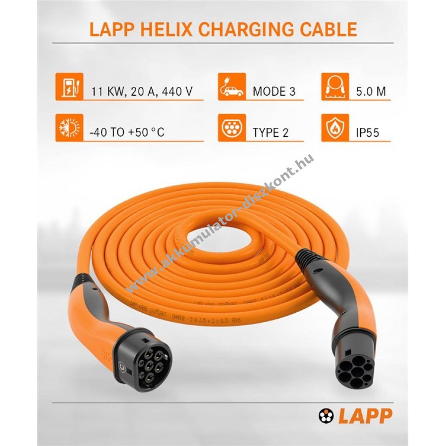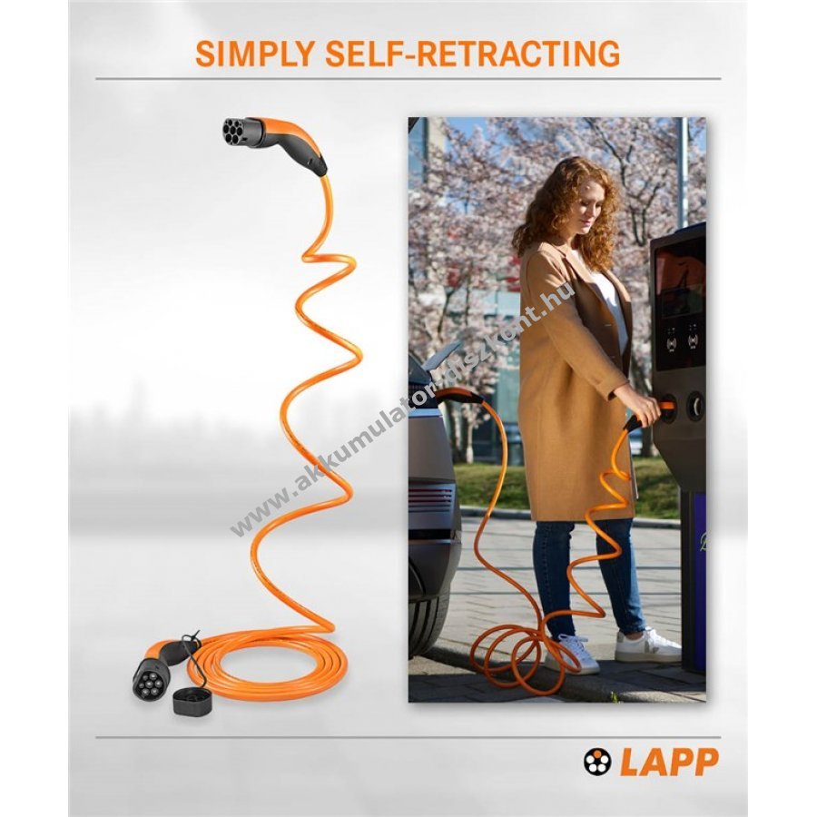 A LAPP type 2 töltőkábele lehetővé teszi az egyszerű és gyors, akár 11 kW-os töltést nyilvános vagy privát töltőállomáson vagy fali dobozon. Szabadalmaztatott, önbehúzó kábel alakmemóriával, amely használat után spirál alakban feltekeredik, és gyorsan eltárolható.A méretstabil kialakítás megakadályozza az EV töltőkábel összegabalyodását A rendkívül robusztus, járműálló kábelek és dugók ezüstözött érintkezőkkel extra tartósságot biztosítanak Olajálló és hosszirányú vízzáró EV töltőkábel magas nedvességvédelemmel az IP55 szabvány szerint, üzemi hőmérséklet -40 °C és 50 °C között. A Type 2 to Type 2 EV töltőkábel helytakarékos és könnyű kezelhetőségű a kis súlyának köszönhetően. Az aktuális IEC és EN szabványok szerint gyártott 3. üzemmódú töltőkábel, amely kompatibilis az európai járművekkel és töltőállomásokkal, valamint a CCS-csatlakozásokkal (Combo 2).