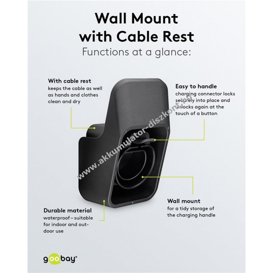 A töltőkábeltartó biztonságosan tartja a dugót a padlótól távol a töltési ciklusok között, hogy megakadályozza a szennyeződést és a csatlakozó sérülését. A töltőtartó szöge lehetővé teszi a kábelcsatlakozó helytakarékos tárolását és a könnyű csatlakoztatást és kihúzást. A fali tartó lefelé néző csatlakozója véd az esővíz és a nedvesség felgyülemlése ellen A kábelaljzat falra szerelése megakadályozza a csatlakozó mechanikai behatások, például áthajtás miatti sérülését. A dugótartó a fúvóka letakarásával megvédi a 2. típusú töltőkábelt a portól, a szennyeződéstől és a víz behatolásától. A töltőcsatlakozó egy kézzel biztonságosan rögzíthető a helyén, és egy gombnyomással újra kioldható a bábu aljzatából. A mellékelt tiplik és csavarok segítségével könnyen felszerelhető a ház vagy garázs falára, pl. a fali csatlakozó mellé (a töltőkábel nem tartozék).