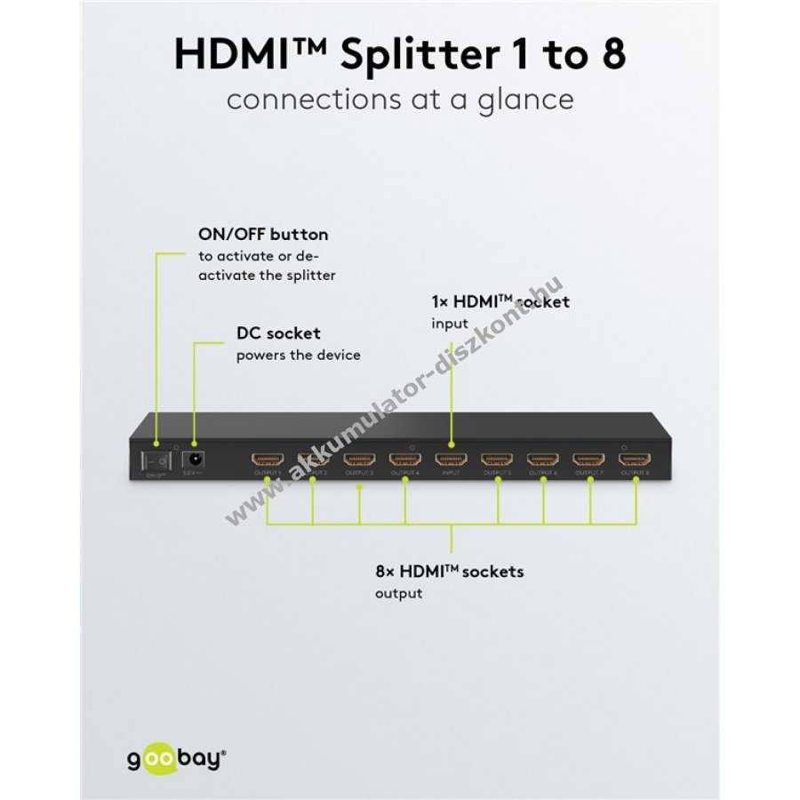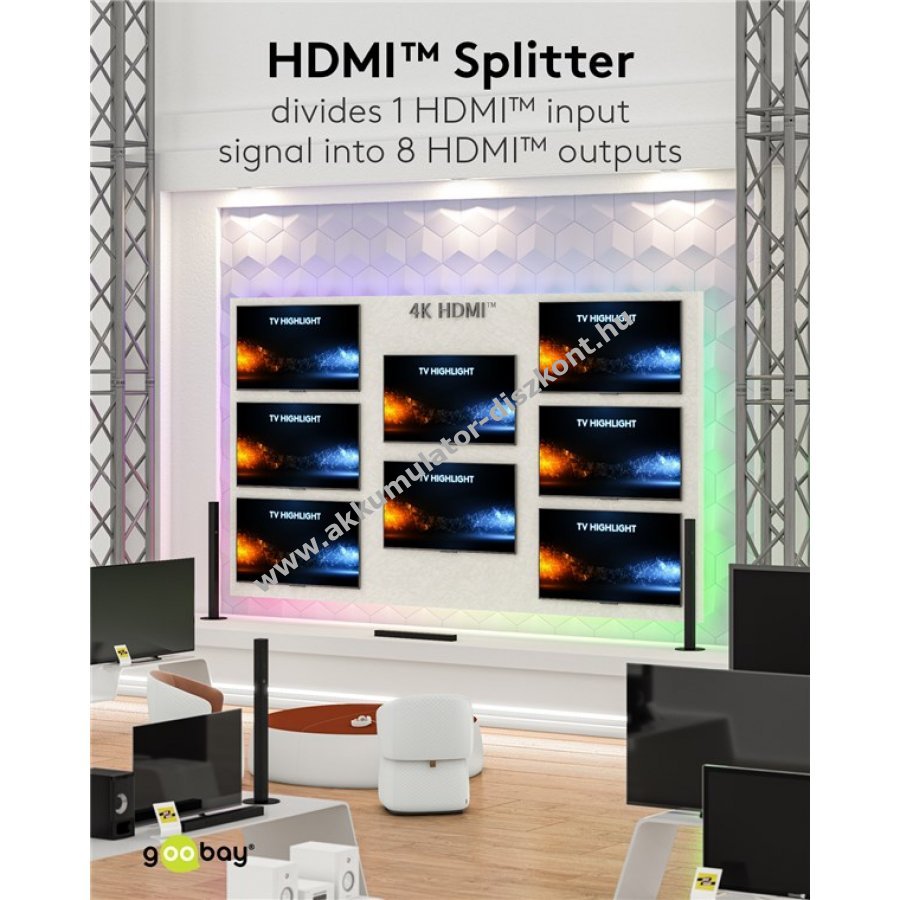 Ez a HDMI elosztó 1 HDMI bemenetről akár 8 HDMI kimenetre tükrözi a hang- és videosignált, például több helyiség egyidejű vetítéséhez.