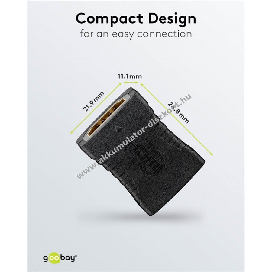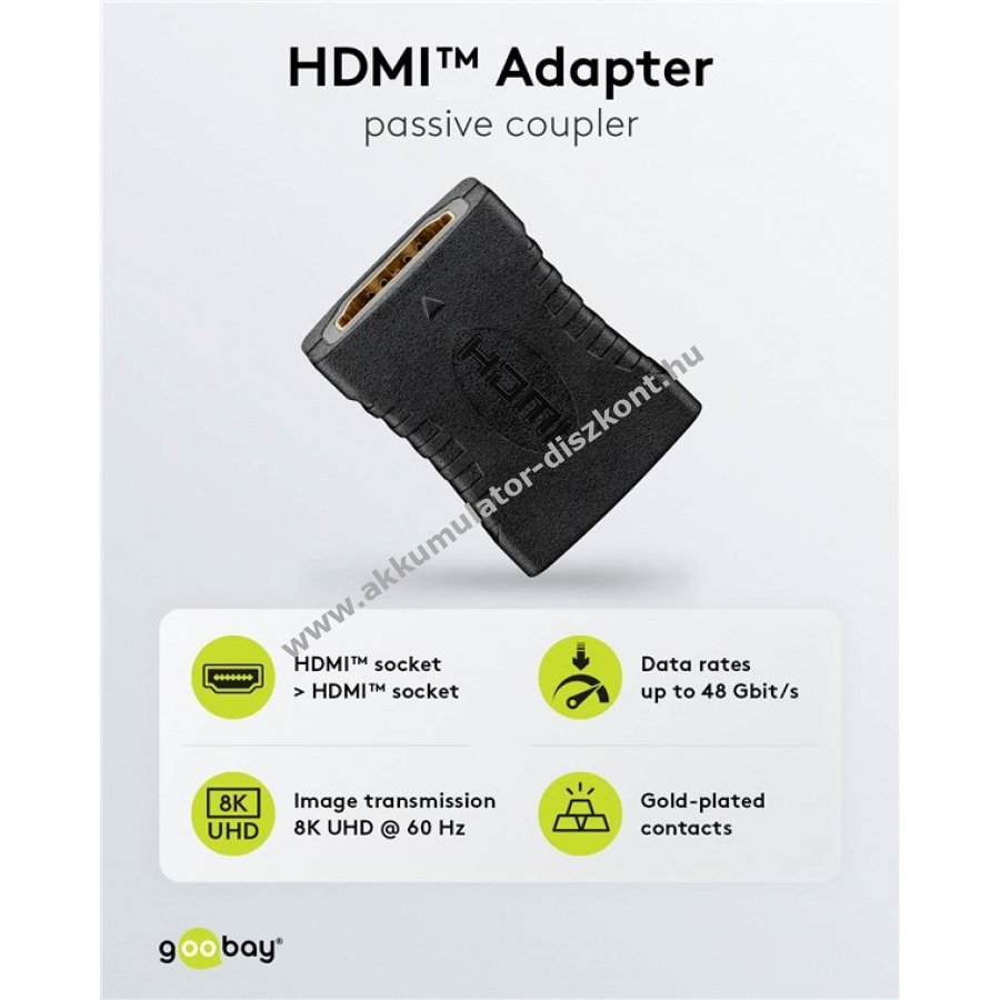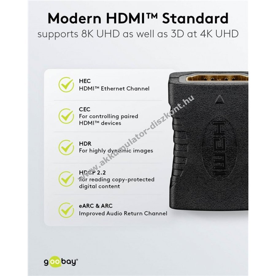 A multifunkciós HDMI-adapter két HDMI-kábelt köt össze hosszabbításként vagy átalakít HDMI-dugót aljzattá. 8K 60Hz és 4K 120Hz felbontást támogat 48 Gbit/s adatátvitellel. Ideális TV-k, monitorok, projektorok, játékkonzolok és streaming eszközök közötti audio-videó átvitelhez. Integrált Ethernet csatorna (HEC) biztosítja a hálózati csatlakozást külön internetkábel nélkül. A CEC funkció lehetővé teszi több HDMI-eszköz egy távirányítós kezelését. Támogatja az 8K UHD, 4K UHD 3D és HDR képfunkciókat, HDCP 2.2 titkosítást, valamint az eARC és ARC audió visszaküldő csatornákat a digitális hangátvitelhez.