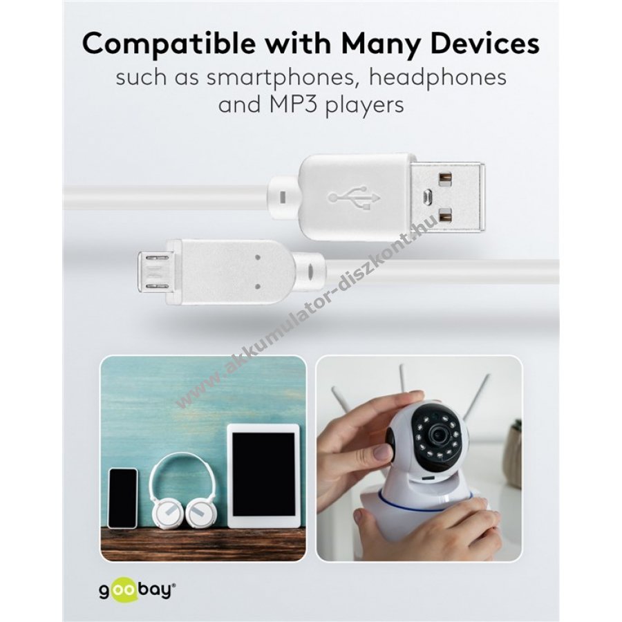 Goobay USB 2.0 nagysebességű kábel, fehér, 1 m-es porvédő táska - USB 2.0 csatlakozó (A típus) > USB 2.0 mikro csatlakozó (B típus) Nagy sebességű adatátvitel akár 480 Mbit/s-ig, számos mobileszközhöz használható például okostelefonok kamerái vagy MP3 lejátszói Figyelem ez egy gépi fordítás, amennyiben hibát talál kérjük jelezze felénk.