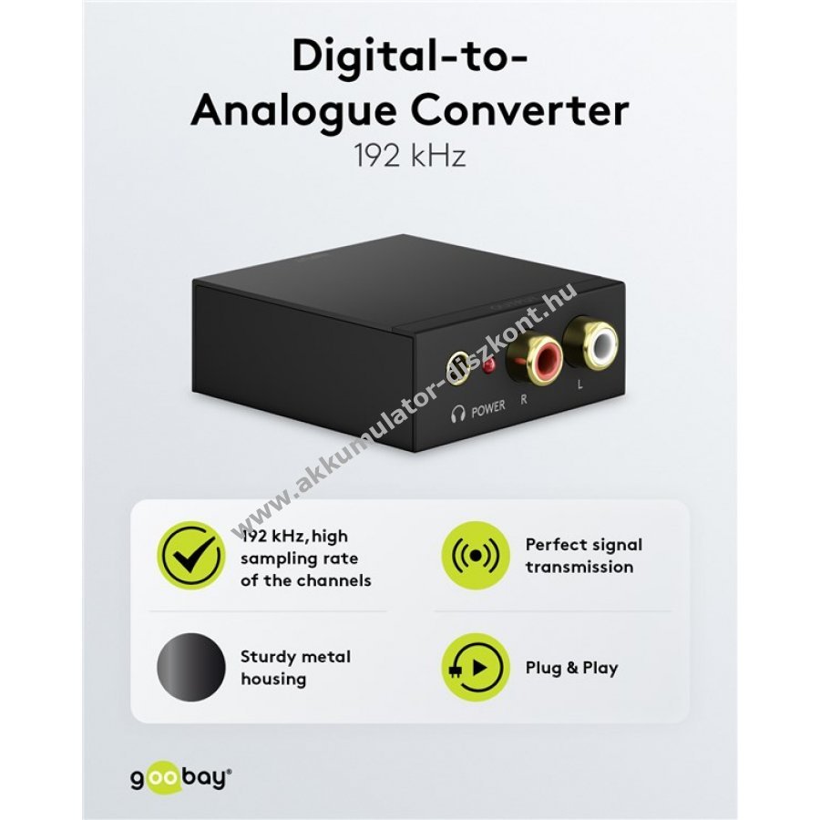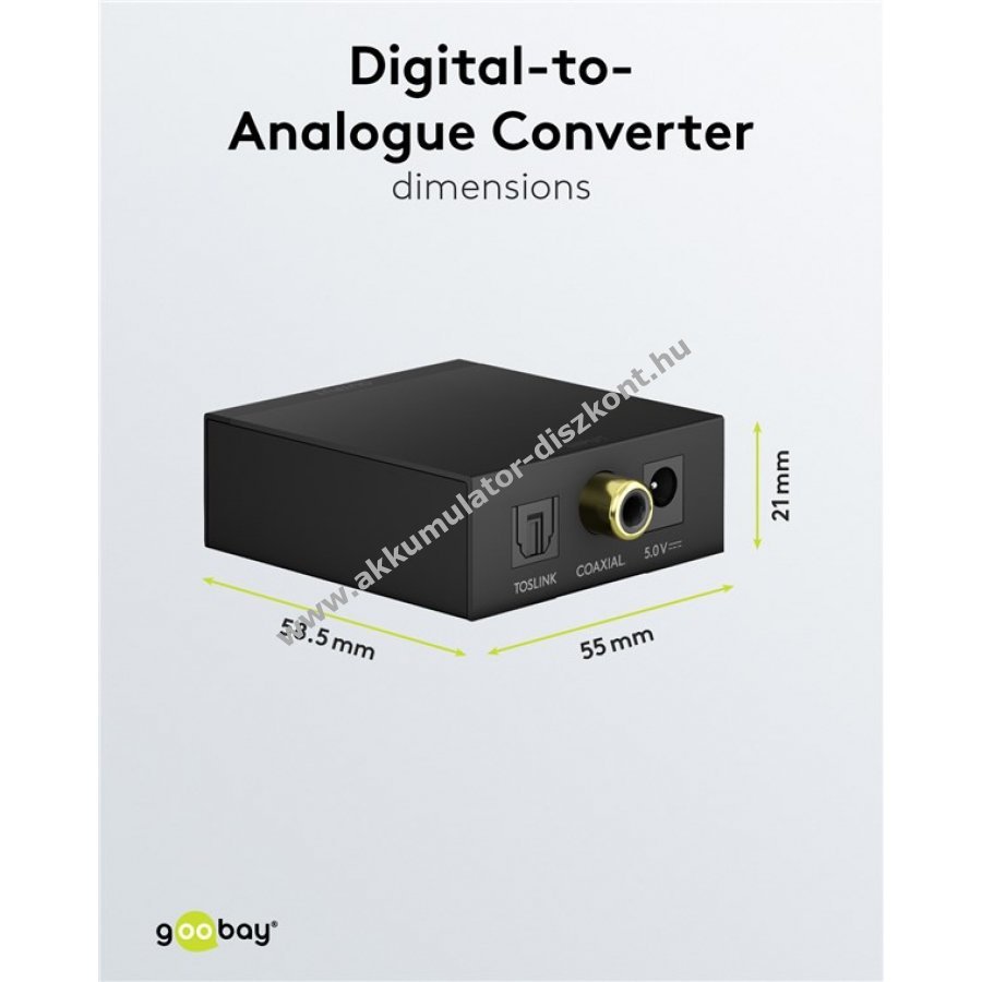 A Goobay digitális-analóg átalakító 192kHz bemeneti digitális audiójeleket (TOSLINK vagy koaxiális) alakít kiváló minőségű analóg sztereó jellé, amely RCA/Cinch vagy 3,5mm jack kimeneten érhető el. A készülék 5V tápegységgel működik, a tápegység a csomag része.