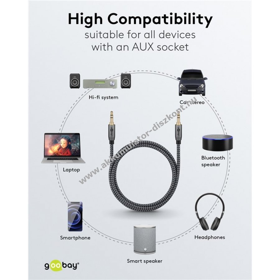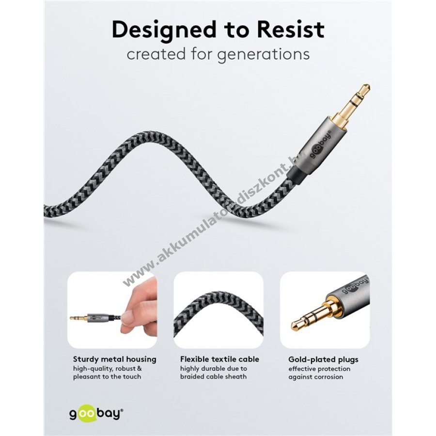 A Goobay Plus sorozat elegáns fém kivitelben Sharkskin szürke színben. Az AUX kábel ideális hangátvitelre okostelefonokról, laptopokról vagy táblagépekről otthoni HiFi rendszerekhez vagy autórádióhoz.