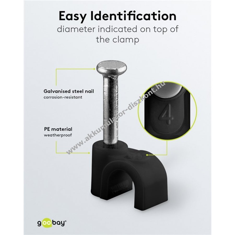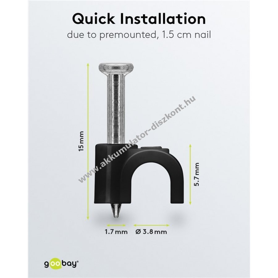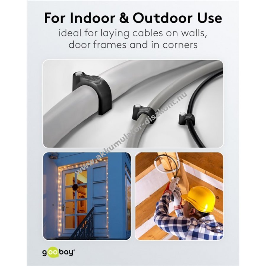 Kábelrendező kábelek falra ajtókeretbe és sarkokba történő rögzítéséhez. Minőségi stabilizált PE műanyag és horganyzott acél szeg. Beltéri és kültéri használatra egyaránt alkalmas jó szigeteléssel korrózió- és öregedésállósággal.