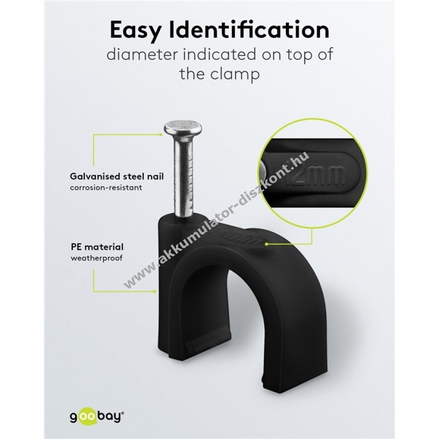 Kábelrendező falra ajtókeretre és sarkokhoz 12 mm átmérőjű kábelekhez. Stabilizált PE műanyagból és horganyzott acél szeggel készült. Beltéri és kültéri használatra egyaránt alkalmas jó szigeteléssel korrózió- és öregedésállósággal.