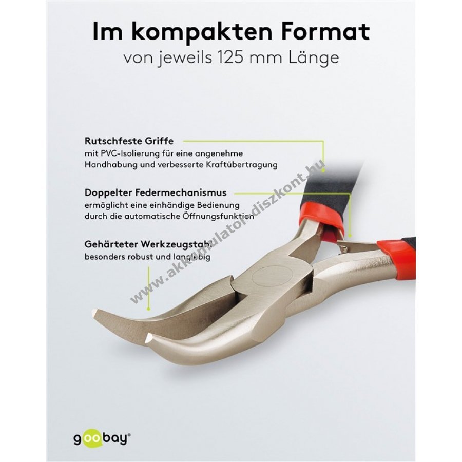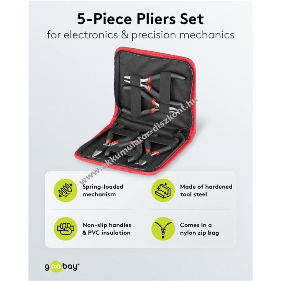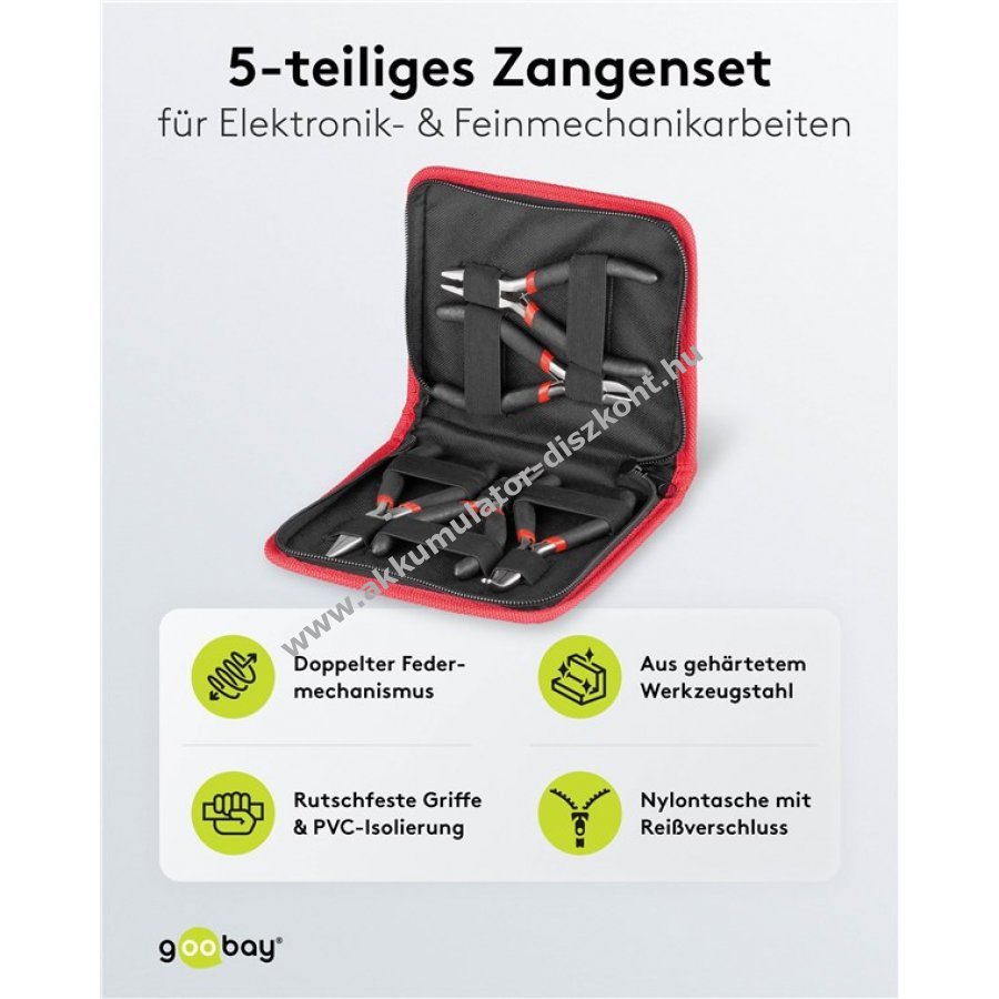 Precíziós elektronikafogókészlet 5 darabos csomagban 125 mm-es hosszúsággal. 1x hegyes fogó 1x 45°-ban hajlított hegyes fogó (telefonfogó) 1x kerek fogó 1x oldalcsípő 1x kombinált fogó. Széles körű felhasználásra alkalmas elektronikai javítástól modellkészítésig ékszerkészítésig vagy otthoni hálózatépítésig. A vékony hegyű fogók ideálisak alkatrészek megfogására pozicionálására és vágására még nehezen hozzáférhető helyeken is. A praktikus rugós mechanizmus automatikus nyitási funkcióval egykezes használatot és kényelmes munkavégzést biztosít. Csúszásmentes markolatok és PVC szigetelés kényelmes kezelhetőséget és jobb erőátvitelt garantálnak. Tartozék nylon cipzáras tárolótáska.