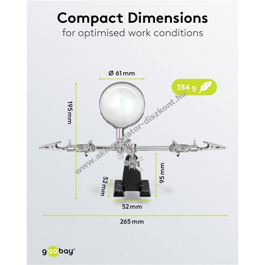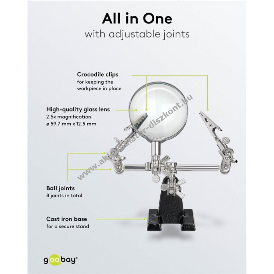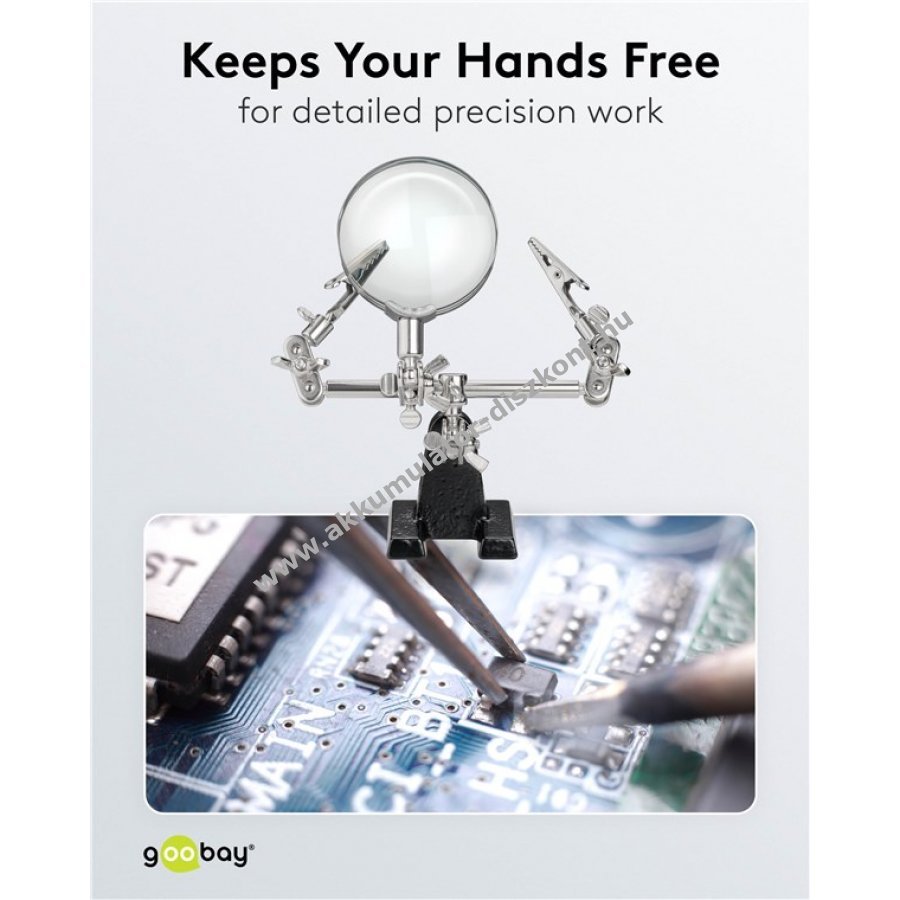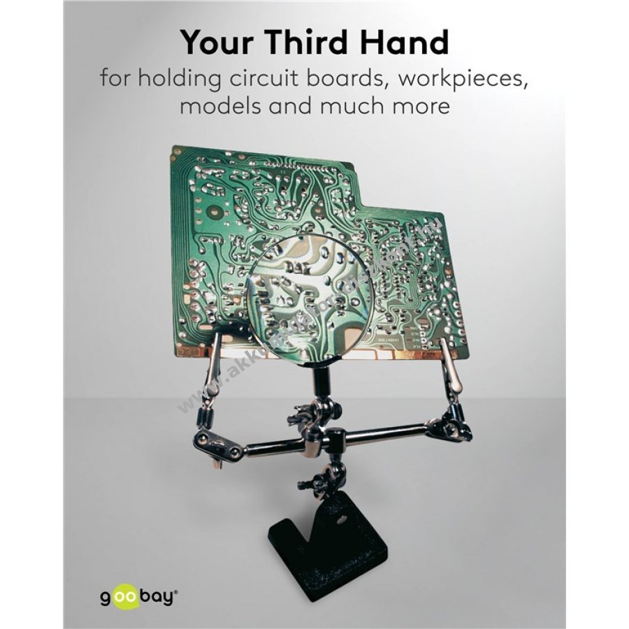A harmadik kéz segíti a munkadarab stabil tartását forrasztás, barkácsolás, ragasztás vagy vágás közben. A nagyító javítja a kis alkatrészek láthatóságát a pontos és kényelmes munkához.