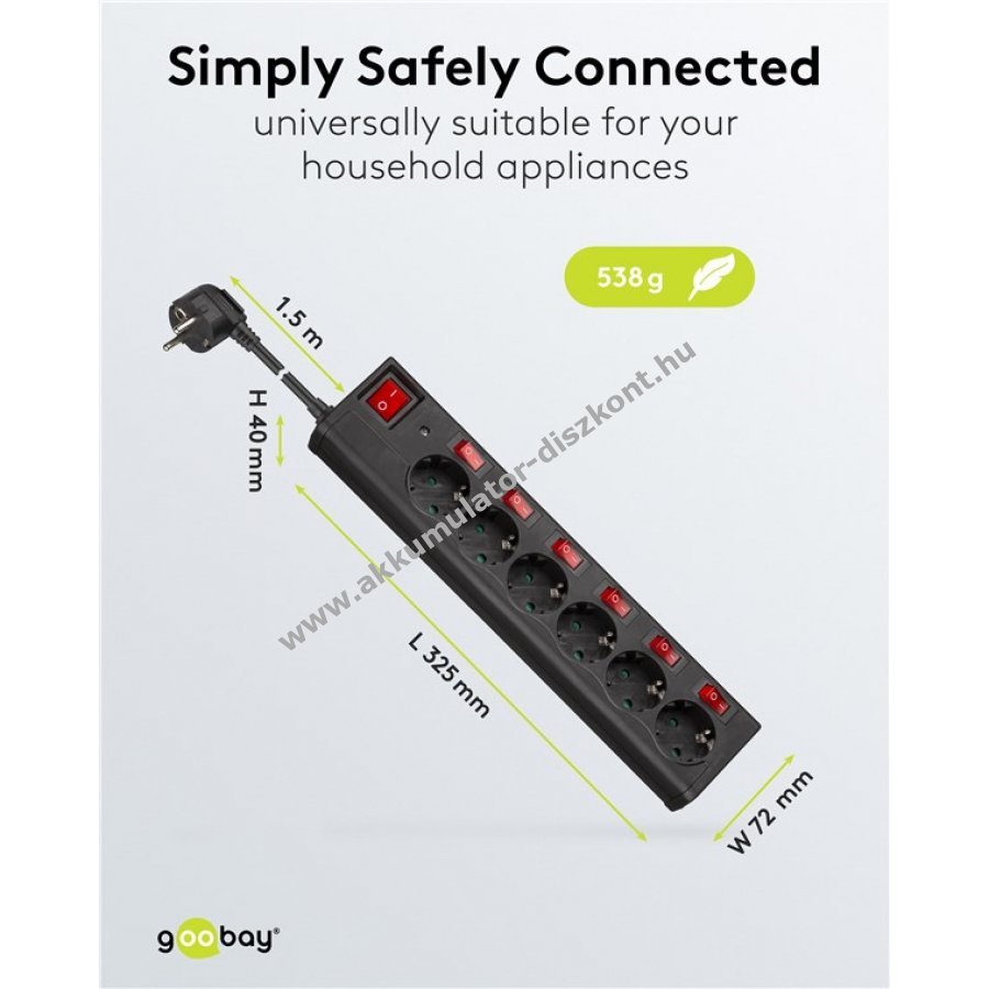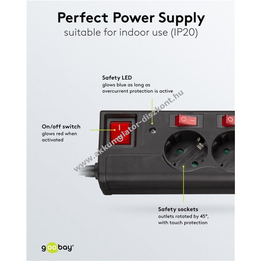 Hatfogas elosztó külön kapcsolható megvilágított kapcsolókkal és főkapcsolóval minden aljzathoz. Biztonsági LED jelzi a túlfeszültségvédelmet az összes aljzatnál. Érintésvédelem növeli a biztonságot. Az aljzatok 45 fokkal elforgatottak a szoros csatlakozóhasználathoz. 1,5 m hosszú kábel és helytakarékos, elfordított fém érintkezős dugó. Beltéri használatra, max 3500 W teljesítmény és 16 A áramerősség mellett.