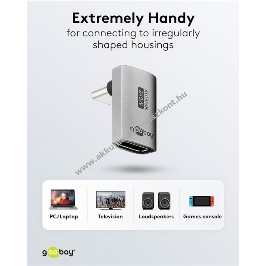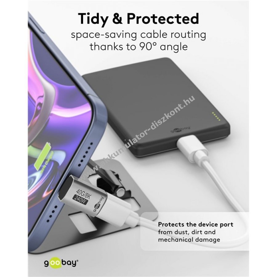 A 90°-os L-alakú USB-C adapter helytakarékos kábelvezetést biztosít szűk helyeken és csökkenti a kábel sérülését. Különösen alkalmas szabálytalan alakú készülékházakhoz, például TV-k vagy hangszórók mélyen elhelyezett csatlakozóihoz. Állandóan csatlakoztatva védi a készülék portját gyakori csatlakoztatás esetén. Támogatja az USB4 technológiát akár 40 Gbit/s adatátvitellel és 240 W töltést Power Delivery (EPR) segítségével. Lehetővé teszi a 8K @ 60 Hz felbontású videókat és kompatibilis USB 3.1, USB 2.0, Thunderbolt 3 és Thunderbolt 4 szabványokkal. Masszív fém háza kényelmes fogást és hosszú élettartamot biztosít. Kompakt mérete miatt ideális utazáshoz és mindennapi használatra.