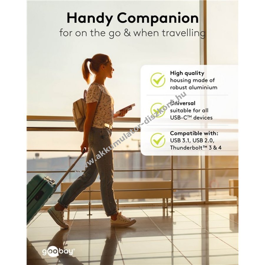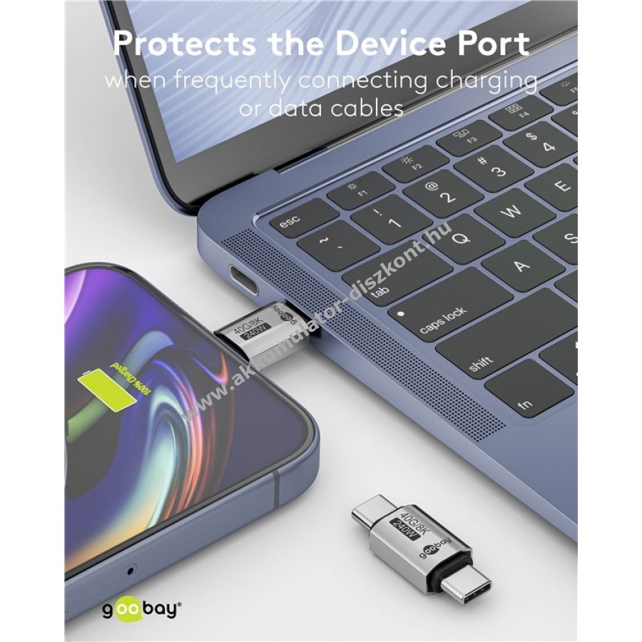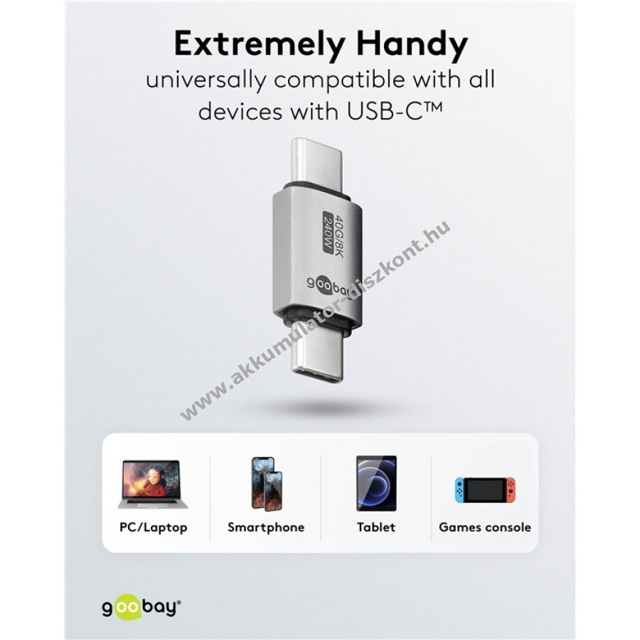 Gender Changer két USB-C aljzat összekapcsolásához univerzálisan használható minden USB-C csatlakozós készüléken például okostelefon laptop vagy tablet Kompakt USB-C csatlakozó védi a készülék portját gyakoribb töltő vagy adatkábel csatlakoztatásakor Támogatja az USB4 szabványt akár 40 Gbit/s adatátviteli sebességgel és 240 W teljesítményű Power Delivery (EPR) töltést Lehetővé teszi a 8K 60 Hz felbontású videó megjelenítést kompatibilis USB 3.1 USB 2.0 Thunderbolt 3 és Thunderbolt 4 szabványokkal Masszív fém ház tartós kézbe fogást biztosít Nagyon kompakt méret bármilyen táskában elfér ideális utazáshoz