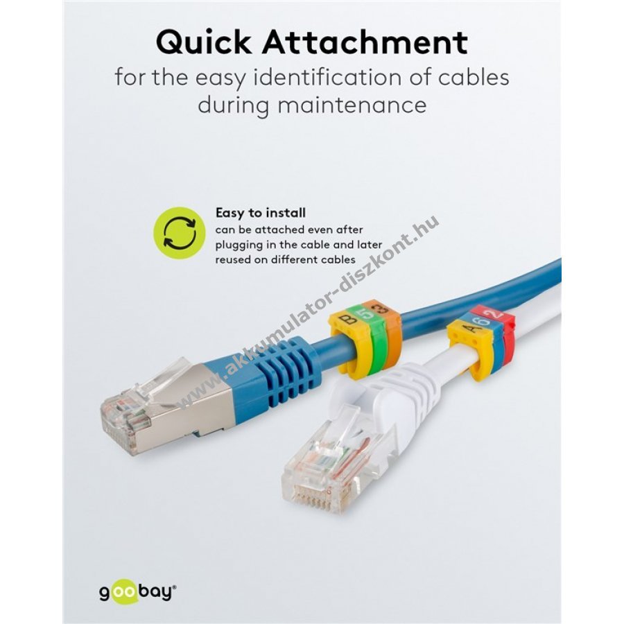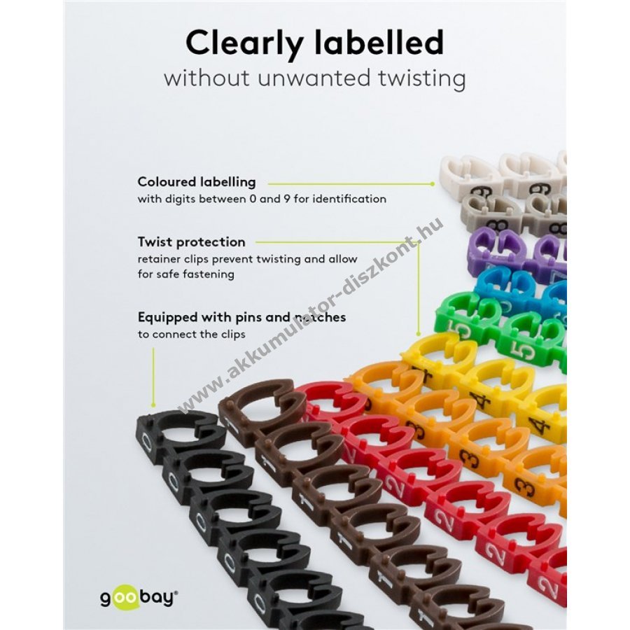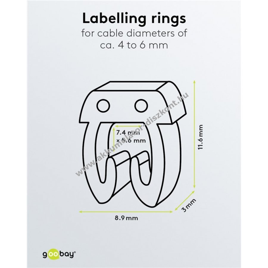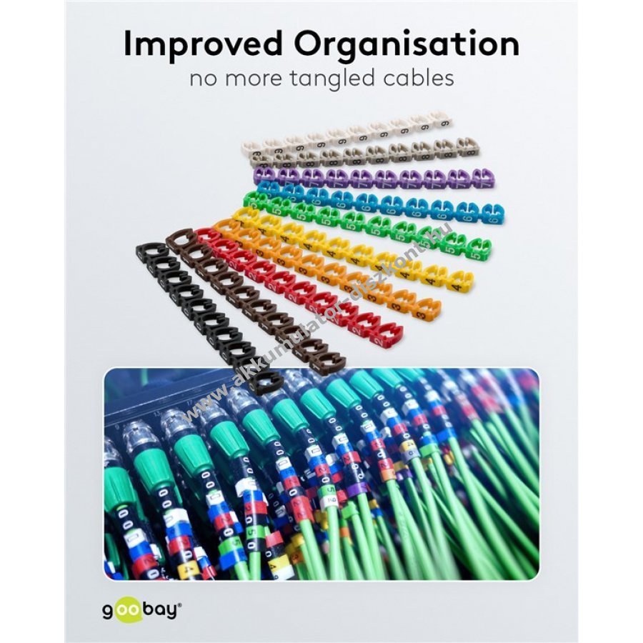 Goobay PVC kábelgyűrűk ideális jelöléshez iparban, építőiparban és kézműiparban. Megakadályozzák a bekötési hibákat és növelik a biztonságot karbantartás, telepítés és javítás során.