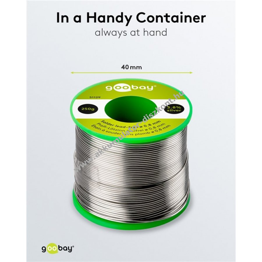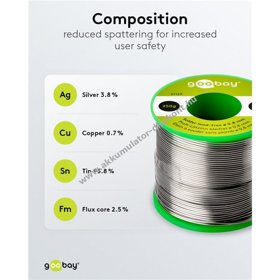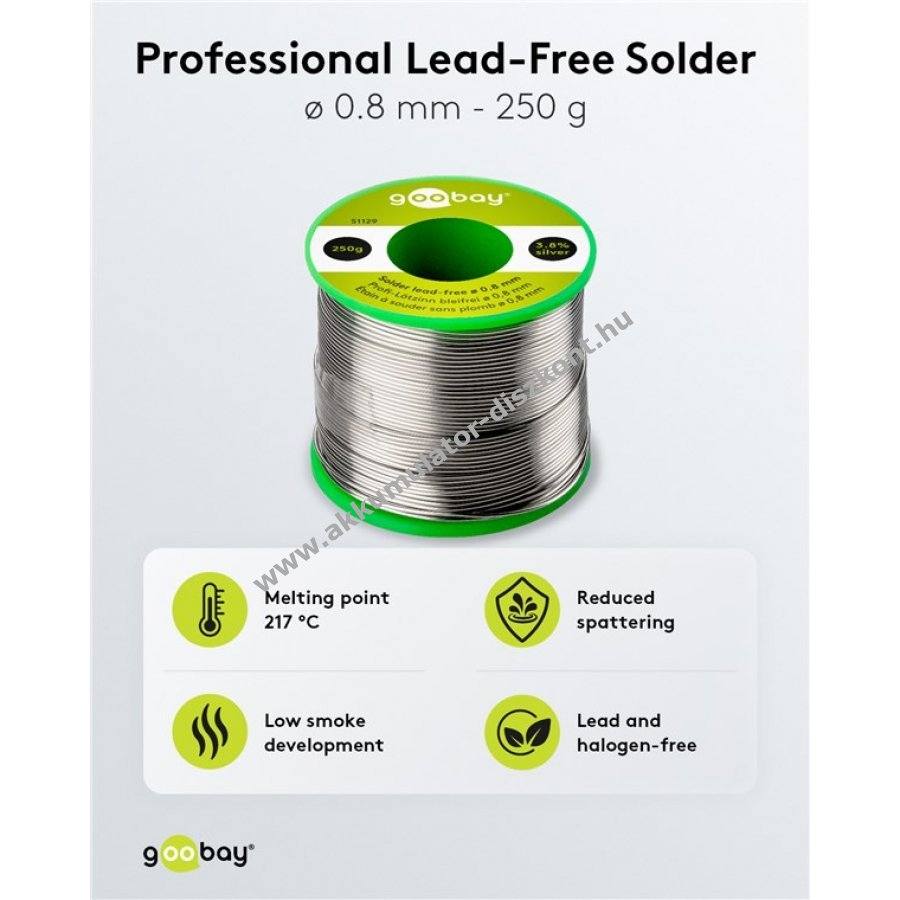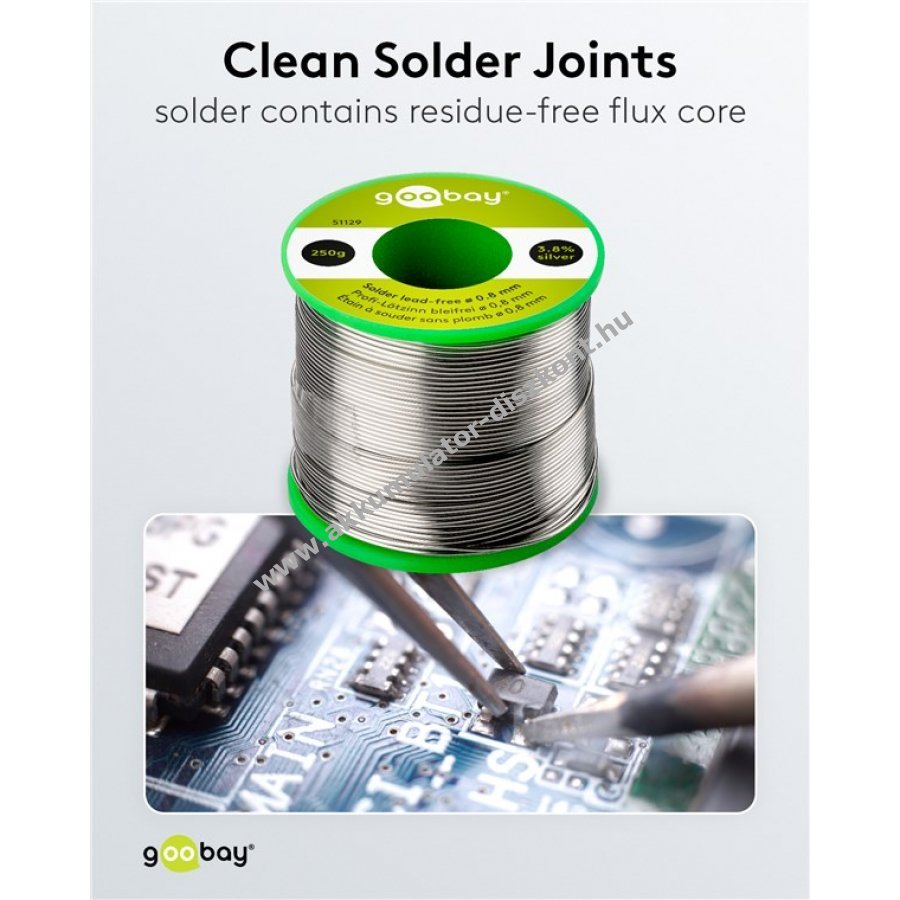Ólommentes forrasztóón 0,8 mm átmérővel és 250 g tömeggel. Magas ezüst és réz tartalommal (3,8% ezüst, 0,7% réz) a jobb áramlás és felületi minőség érdekében. Beépített fluxus maggal a könnyű és hatékony forrasztáshoz. Alkalmas elektromos alkatrészekhez, például NYÁK-okhoz, SMD-khez, DIP-ekhez, kábelekhez, televíziókhoz, fejhallgatókhoz és mikrofonokhoz. Halogénmentes, alacsony füstképződéssel és csökkentett fröcsköléssel a biztonságos használathoz. No-Clean fluxus maggal, így nem szükséges utólagos tisztítás. Ideális alacsony hőmérsékletű kézi és gépi forrasztáshoz.