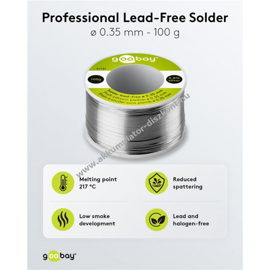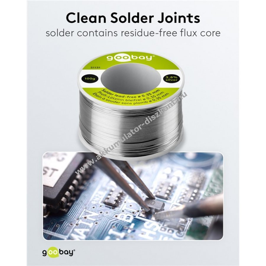 Ólommentes forrasztóón vékony 0,35 mm átmérővel kényelmes adagoláshoz és apró alkatrészekhez. Magas ezüst és réz tartalom javítja a folyást és a felületi minőséget. Kolofónium alapú fluxusmag biztosítja az egyenletes nedvesedést. No-clean technológia miatt nem szükséges utólagos tisztítás. Csökkentett fröcskölés növeli a biztonságot és védi a munkadarabot. Halogénmentes és alacsony füstképződésű. Ideális alacsony hőmérsékletű kézi és gépi lágyforrasztáshoz.