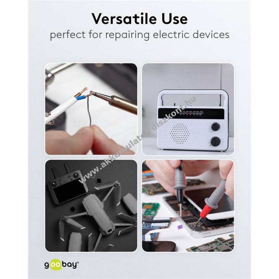 Elektronikai alkatrészekhez, nyomtatott áramkörökhöz, SMD és DIP alkatrészekhez, kábelekhez, televíziókhoz, fejhallgatókhoz és mikrofonokhoz.